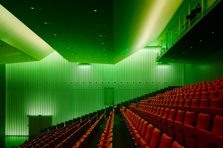 Die Grundbeleuchtung des großen Saals ist flexibel und kann durch die Beleuchtungssteuerung auf jede Nutzungsanforderung eingerichtet werden. Durch Deckenfluter-Lichtbänder werden Teile der gestaffelten Decke aufgehellt, um die Schwere der Decke zu nehmen und die Raumhöhe aufzulockern. Eine Kombination von gut ausgeblendeten Fokus-Strahlern, bestückt mit Hochdruckentladungslampen und Halogenlampen ermöglichen hohe Beleuchtungsstärken, aber auch eine dezente Beleuchtung für feierliche Anlässe. Besonders bei Banketten oder ähnlichen Veranstaltungen zeigt sich die Qualität der Farbwiedergabe und Brillanz der Halogenleuchtmittel. Das besondere Erscheinungsbild des Saals prägt eine hinterleuchtete Wandstruktur. Die Wände werden von Oben und Unten durch speziell konstruierte RGB-Wandfluter beleuchtet, und bringen somit die vorgesetzten Holzlamellen zur Geltung. Die Helligkeit und Farbe der Saalwände können dynamisch gesteuert werden und tauchen damit den ganzen Saal in ein beliebig veränderbares Ambiente.