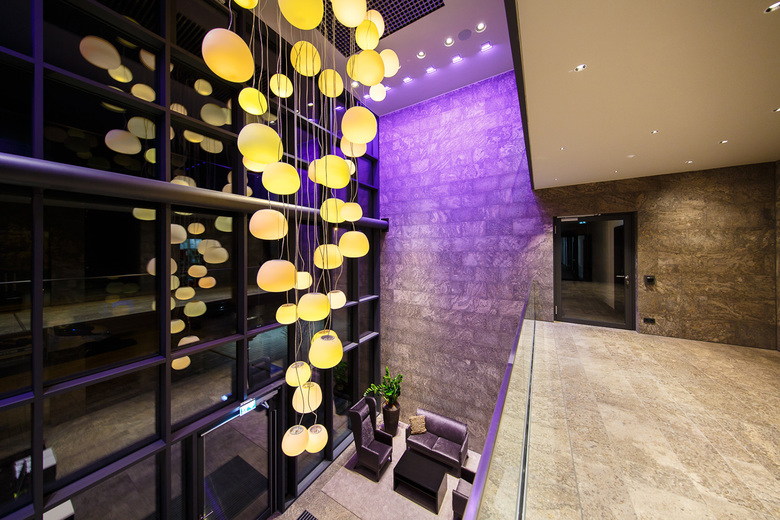 Je nach Jahres- und Tageszeit oder sogar nach besonderen Ereignissen verändert sich die Stimmung in der Lobby mit einem besonderen, spielerischen Lichtobjekt, welches jedes Mal ein neues Erlebnis schafft. Die Halle verbindet den Verwaltungsbau und das Hotel. Die Büros, Schulungs- und Konferenzräume wirken hell und freundlich. Sie sind mit Langfeldleuchten und einem hohen Lichtkomfort ausgestattet.