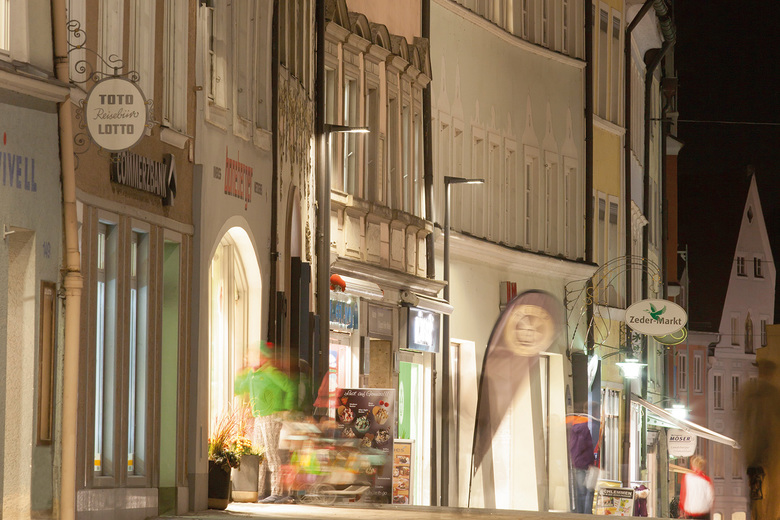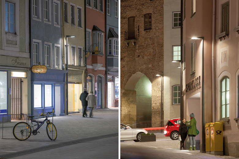Darüber hinaus sprachen klare wirtschaftliche Vorteile für die LED-Leuchten. Im Vergleich zu konventioneller Technik mit Halogenmetalldampflampen sorgen niedrigere Anschlusswerte für Energieeinsparungen und die lange Lebensdauer der LED-Lichtquellen senkt spürbar die Wartungskosten. Durch die Möglichkeit der mehrstufigen Regelung kann der Lichtstrom bedarfsgerecht angepasst werden. Auf dem Hauptplatz in Landsberg reduzieren in die Leuchte eingebaute und ab Werk programmierte elektronische Dimmer Eco Step Dim Advanced das Niveau der Straßenbeleuchtung um 22:30 Uhr auf 75% und um 24:00 Uhr auf 50% des Ausgangswertes. Spezielle Versorgungs- und/oder Steuerleitungen sind dafür nicht notwendig.
