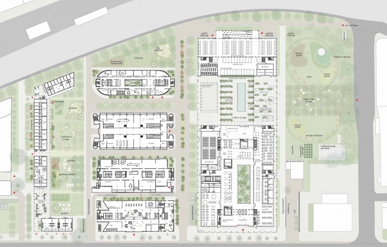 Unser Vorschlag soll den erst 20 Jahre "alten" Bestand revitalisieren und mit neuen Impulsen ergänzen. Kernidee der Planung ist eine starke, städtebauliche Setzung, durch die ein neuer Mainova-Campus entsteht. Im Osten wird der Campus durch den Neubau der ‚Mainova-Welt‘ und im Westen durch den Neubau von Werks- und Mietwohnungen eingerahmt. Ergänzt werden die Stadtbausteine durch einen neuen Bürgerpark, dem ‚Park der Energie‘, der den Campus zum Quartier öffnet. Bei der Freiraumgestaltung und insbesondere dem Park haben alle Architekten gemeinsam mit DGJ Landscapes gearbeitet, weil wir alle überzeugt sind, dass ein städtebaulicher Entwurf "aus dem Grünen heraus" gedacht werden muss. So wird der Campus in den Stadtteil integriert und bietet Bürgerinnen und Bürgern Naherholung und Identifikationspotenzial. Eine Herausforderung der städtebaulichen Neuordnung des Mainova-Geländes bestand darin, die sehr unterschiedlichen Vorgaben in ein homogenes Konzept zu überführen.