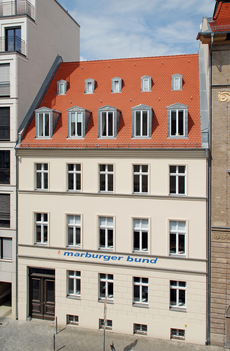 Das 1834 in der Friedrich-Wilhelmstadt gebaute Haus wurde im II. WW schwer beschädigt und in den 50-iger Jahren als Institut der Charité notdürftig wiederhergestellt. Nach mehrjährigem Verfall wurde gemeinsam mit dem Denkmalschutz ein Nutzungskonzept entwickelt, das es erlaubte die auf unterschiedlichen Höhen liegenden Geschosse zu verbinden. Der Marburger Bund hat dieses Konzept realisiert und nutzt das Haus nach seinem Umzug von Köln nach Berlin als Zentrale.