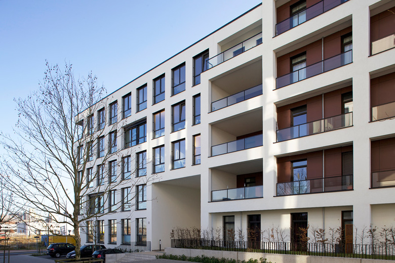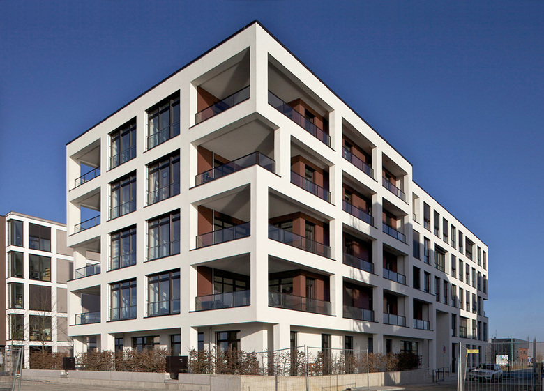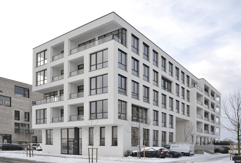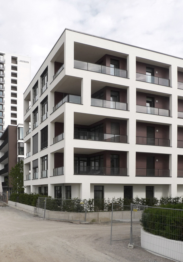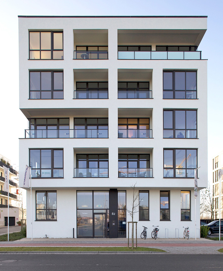 Das Wohn- und Geschäftshaus bildet am Schnittpunkt zwischen Weser und Europahafen ein Gelenk innerhalb des neuen Stadtquartiers. Der großzügige, zweistöckige Durchgang trennt die Wohnnutzung von den Büros, die Wohnungen mit den großzügigen umlaufenden Loggien besitzen alle Wasserblick.