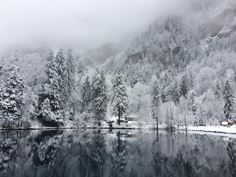 Die gewaltige Landschaft rund um den Blausee wurde vor 15’000 Jahren durch einen Felssturz geformt. Das mineralreiche Wasser verleiht dem See seine tiefblaue Farbe – und den Namen. Seit dem 19. Jahrhundert ist der Blausee eine Tourismusdestination auf der Route ins Wallis. Der kleine Pavillon nimmt die Poesie des Ortes auf und schreibt die hundertjährige Tourismusgeschichte weiter, ohne dabei in Nostalgie zu verfallen. Dabei diente das archaische Bild des grossen schützenden Dachs in der weiten Landschaft, wie man es von alten Berner Bauernhäusern kennt als Leitbild. Drei Lagen Schindeln, welche auch im Innern des Pavillons sichtbar bleiben decken das mächtige Dach. Keine Dachfenster oder Sanitärrohre durchstossen die kompakte Konstruktion und zudem wurde auf eine Dachrinne verzichtet. So bildet sich an einem regnerischen Tag entlang der Traufkante ein Vorhang aus Wassertropfen.