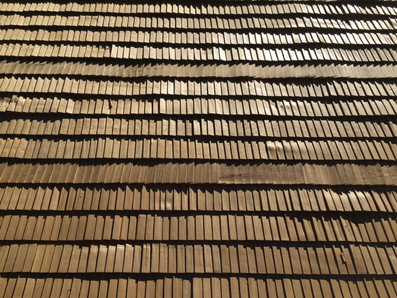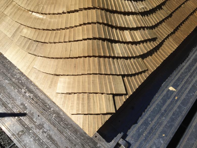 Das Dach besteht aus lokalem Fichtenholz und wurde mit ortsansässigen Handwerkern gebaut. Das Schindeldach wurde von einem lokalen Schindelmacher, einem der letzten im Berner Oberland, ausgeführt. Konstruktive Gründe bedingten die «geschleifte Fribourger-Technik», die den Grat der Schindel nicht scharfkantig, sondern gebrochen artikuliert: Jede fünfte Schindelreihe wird in die entgegengesetzte Richtung verlegt, damit die Geschwindigkeit des fliessenden Wassers gebremst wird. Diese Technik ist konstruktiv nachhaltiger und gibt dem Dach seine organische Erscheinung.