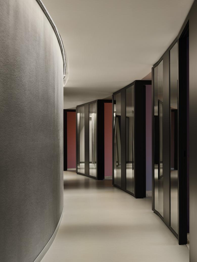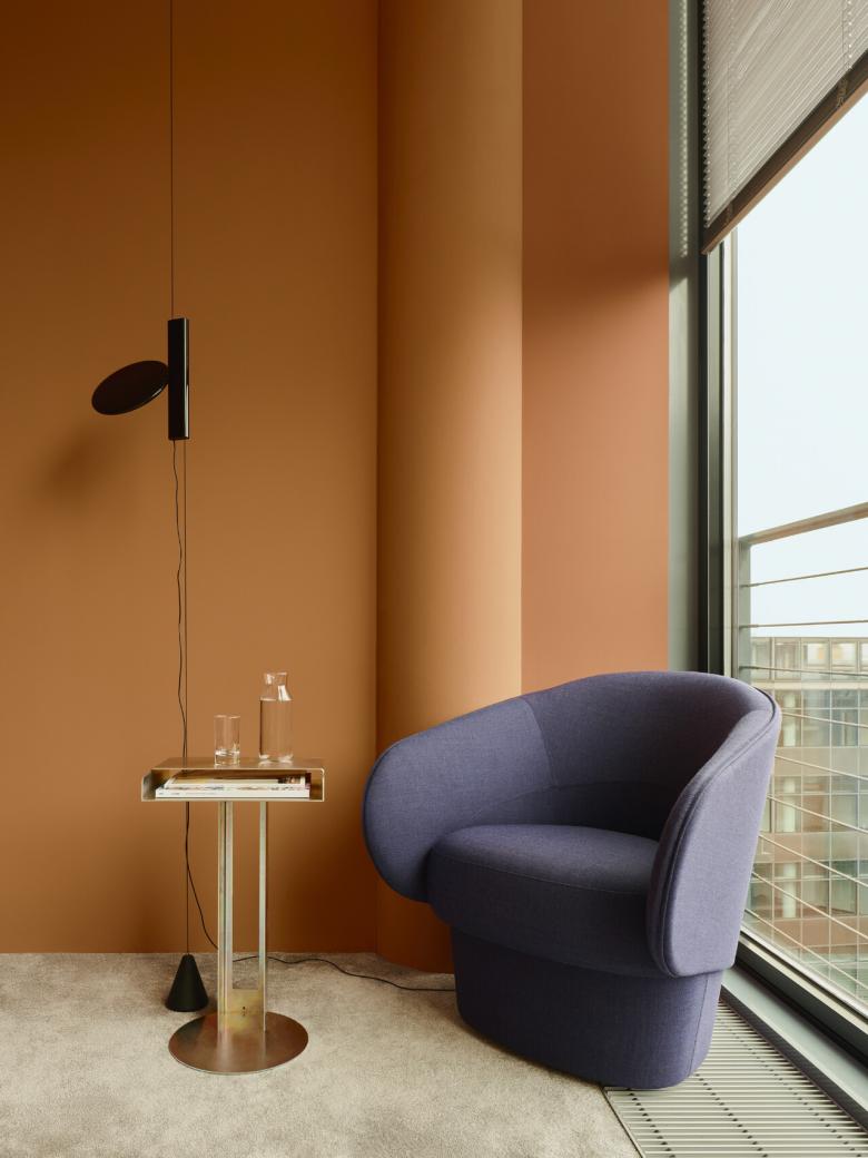 Im Dialog mit der von Helmut Jahn geprägten Architektur antwortet Kinzo mit holzwarmem, haptischem Interieur, präzise Textilien und akzentuierte Farben. Das Farbkonzept folgt dem Wandel des Himmels und der Jahreszeiten am Tiergarten—ein räumlicher Spaziergang entlang des sanft gebogenen Innenflurs.