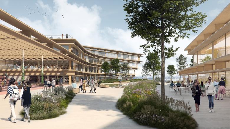 Der den Campus umgebende Freiraum wird weitestgehend als ökologisch wertvoller Naturraum belassen, der sich zwischen den Gebäuden als organisch geformte Grüninseln ausdifferenziert. Die Gebäude sind großzügig durch bodengebunden begrünte Pergolen miteinander verbunden. Die Dächer sind extensiv begrünt und mit Photovoltaik ausgestattet und teilweise für Terrassennutzung vorgesehen. Die Orientierung der Baukörper gewährleistet eine vorteilhafte Winddurchströmung des Standortes.