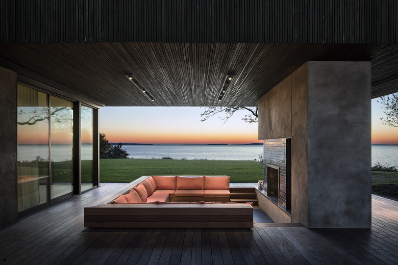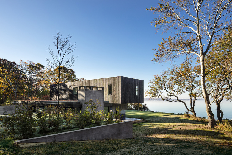 From afar, the house is an abstract cedar-clad facade, the wood charred to match the color of surrounding tree bark. However, upon approach a cut in the earth clearly provides entry to a glass-enclosed court with sweeping water views.