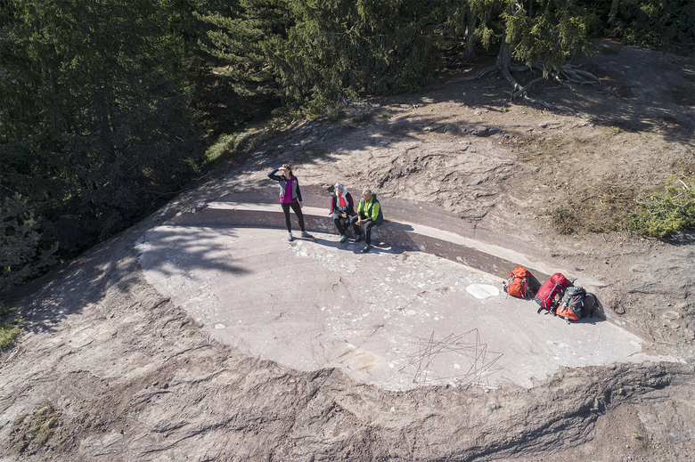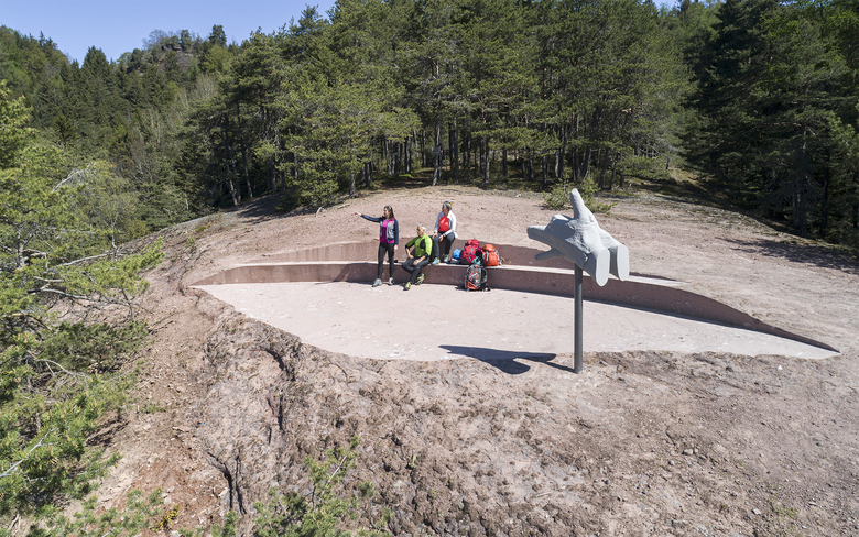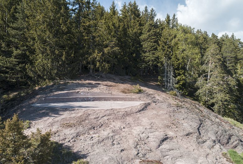 The lowest of the three rock formations – the Timpfler-Knott – prevails a calm, almost mystical atmosphere. Circular incisions in the rock transform the terrain and create a rest area. The circle as symbol for the eternal is despite its fragmentariness comprehensible.