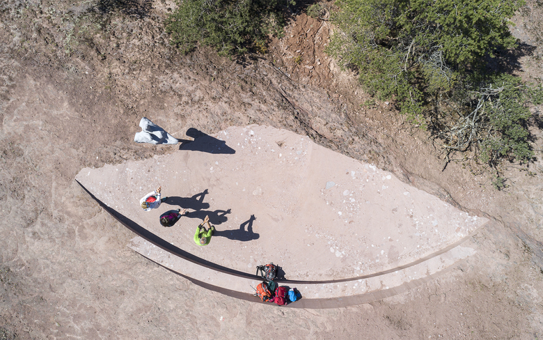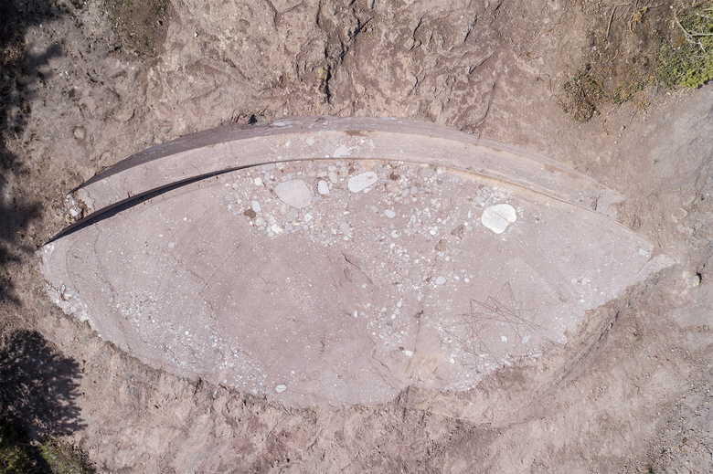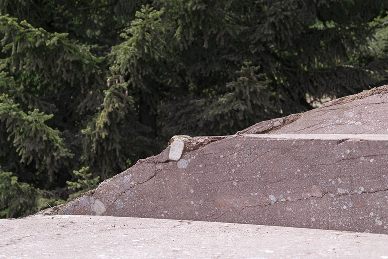At the Rotstein-Knott – in the immediate vicinity of the„Knottnkino“ – conceptualized and created by the artist Franz Messner in the year 2000 – evolves through circular cuts in the terrain, an even, from the porphyry elaborated space with a bench and a backrest. The circular segments immerge into the landscape and dissolve. The only thing that remains on the surface are traces in the form of lines
