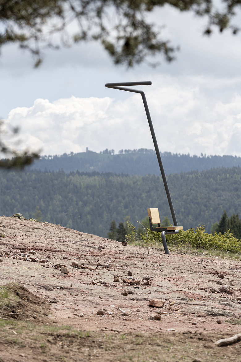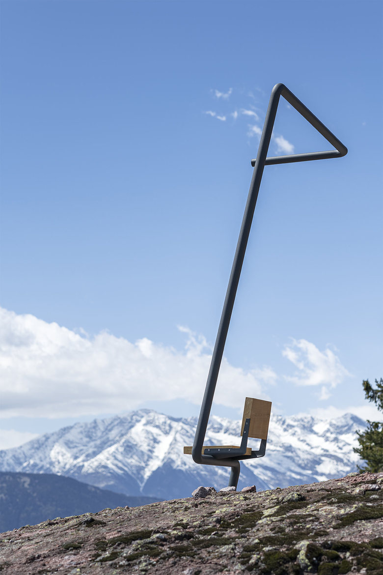 The installation ‚Attimo‘ was realized after the sketches of the late artist Franz Messner and consists in the arrangement of five chairlift seats alongside an imaginary and hazardous route directly over the rocky hill. With a spectacular view on the village the installation creates continuity of the cable car of Vöran and connects the village through a ‚Direttissima‘ with the Beimstein-Knott.