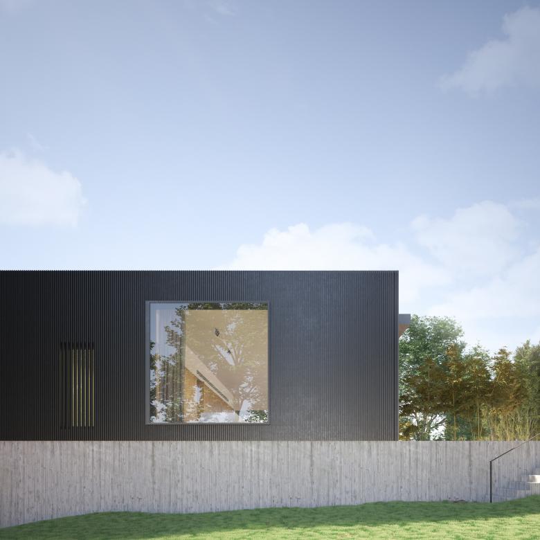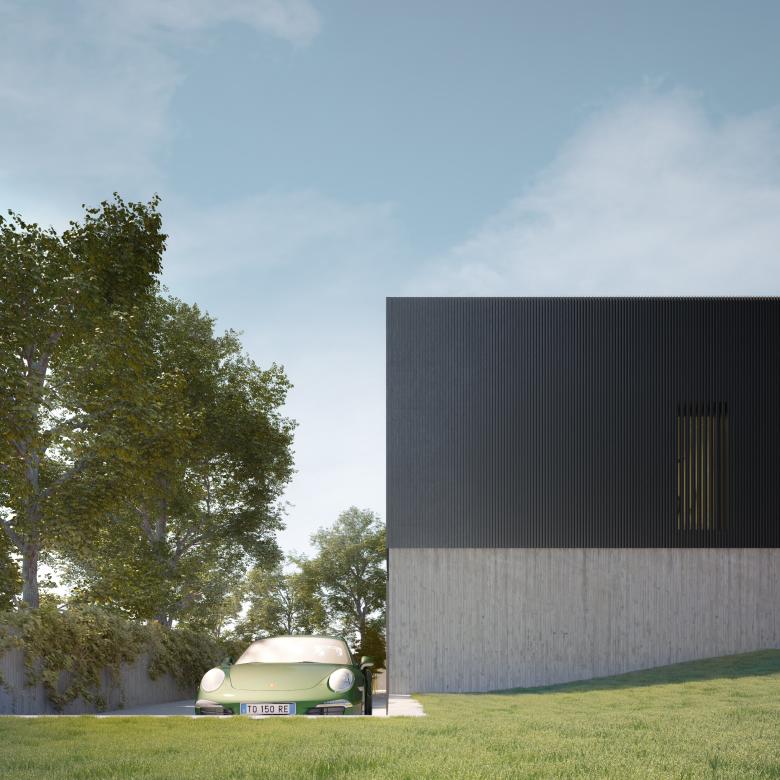 L’edificio si sviluppa su due piani, con un basamento in calcestruzzo a vista parzialmente interrato sul quale poggia un volume caratterizzato da un rivestimento metallico che emerge dalla quota del terreno.