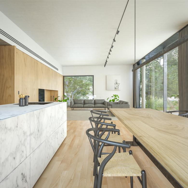 Lo spazio giorno è caratterizzato da una grande parete attrezzata rivestita in legno, che dona unità e calore all’ambiente. Il pavimento, anch’esso in legno, dialoga con il metallo e il calcestruzzo delle pareti esterne, dando domesticità agli spazi della casa ed evidenziando la continuità con il terrazzo.