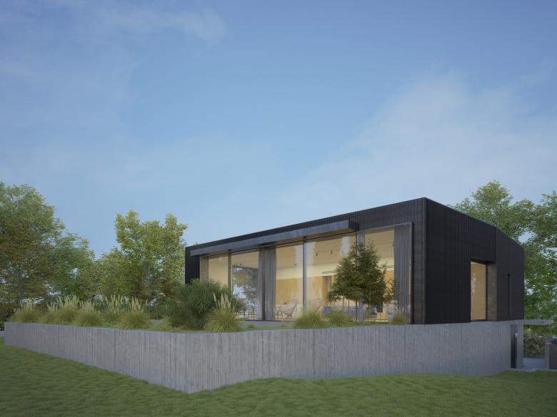 All’esterno, il rivestimento metallico del piano superiore maschera la presenza delle aperture degli ambienti di servizio, fungendo da frangisole, ed è bucato soltanto dalle grandi vetrate delle camere da letto, che si aprono sul paesaggio circostante.
