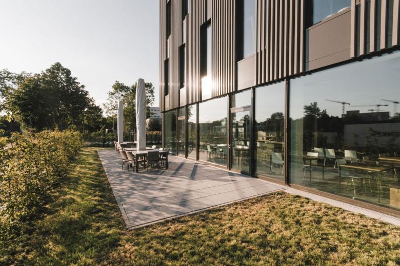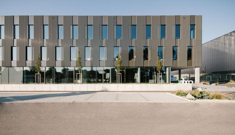 Das Verwaltungsgebäude mit Büro- und Kommunikationsflächen, Laboren, einem Mitarbeiterrestaurant sowie Schulungsräumen ist in Hybridbauweise entstanden – als Zusammenspiel aus Stahlbeton, Holzbaukonstruktion plus Aluminiumbauteilen. Neben der schnellen Bauweise zählt hier auch der Aspekt der Nachhaltigkeit, insbesondere durch den Baustoff Holz, der zugleich ein angenehmes Raumklima schafft.