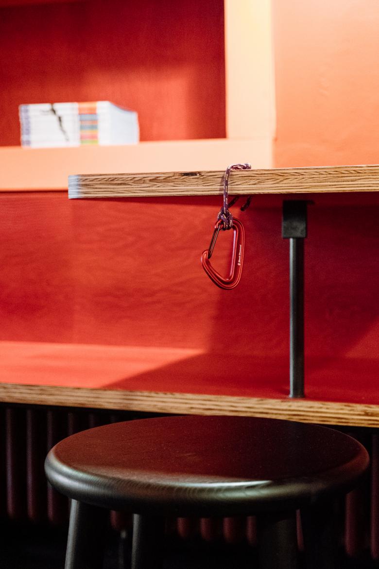 A consistent graphic concept sets selective accents. Following the principle of upcycling, the project focuses on reuse of materials, reorganizing of spaces and reassembling of chromatic scenario. The vaulted roof has been recovered and integrated into the new environment with the desire to give character to the space. Between the lively and dynamic bar area and the more intimate and reserved restaurant area, the room that expresses the theme of the project – the experience of the bivouac near the Croda dei Toni - has been created. It has been placed in an arched niche with the dominating red color, where the folding tables have been completed with climbing carabiners, recalling those of the bivouac. The high mountain bivouac has been revived in the Biwak 12. As a reminder of the link with the history and tradition of the area, the original Tyrolean “stube” has remained intact.