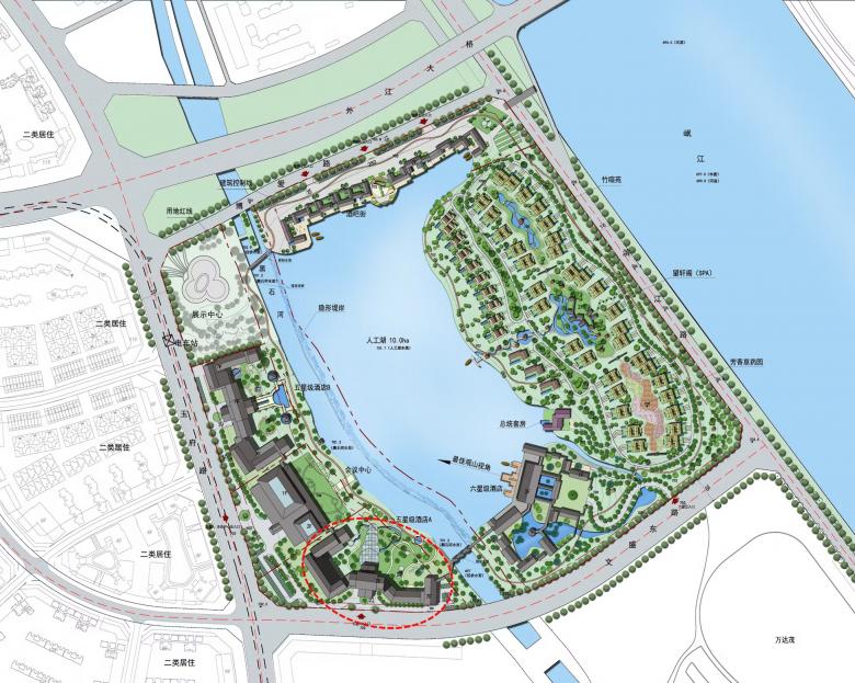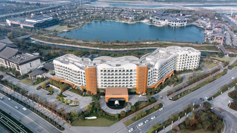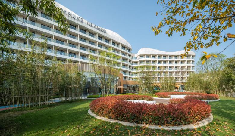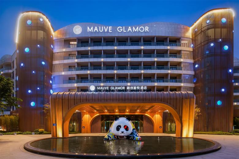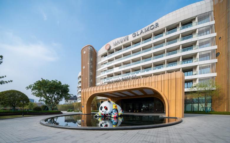 The immediate surroundings form a hotel group arranged around an artificially created lake, consisting of a 6-star hotel, a 5-star hotel, the 'Mauve Glamor' brand panda-themed hotel, a conference centre and a bar street, with a total gross floor area of around 140,000 square meters.