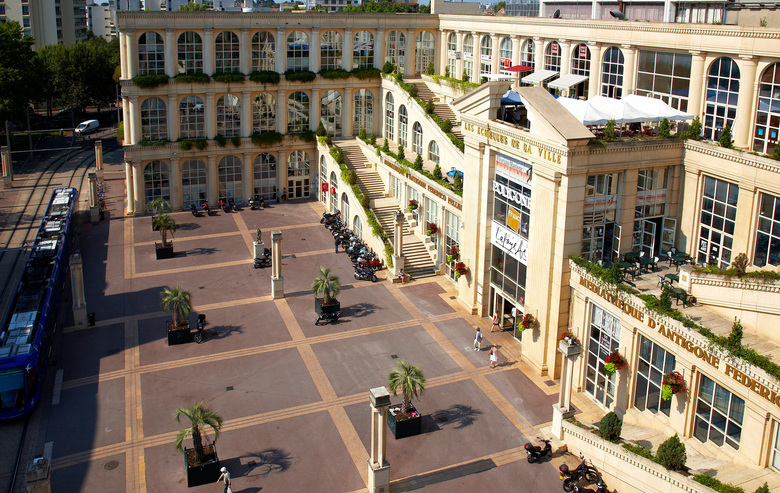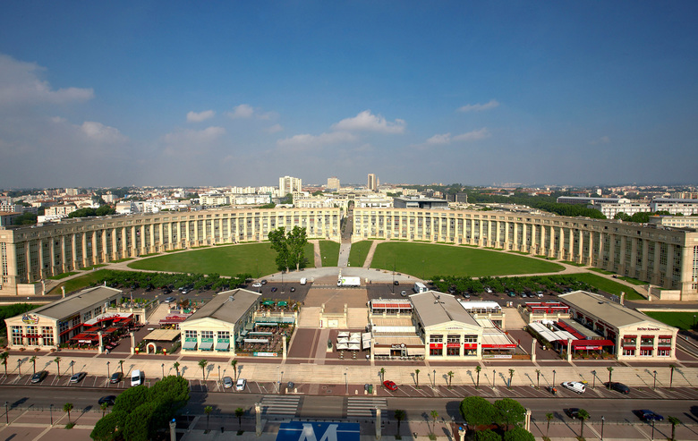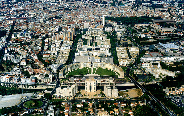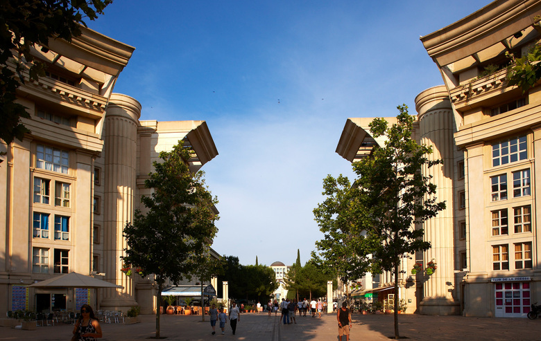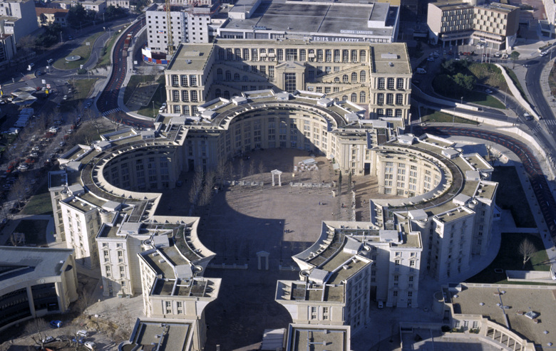 El proyecto de Antigone nace en 1979, cuando el nuevo ayuntamiento de Montpellier, capital de la región Languedoc-Roussillon, decide realizar una vasta operación urbanística en unos terrenos adquiridos al ministerio de defensa y que habían albergado una de las primeras fábricas de aviones militares de francia. El terreno consistía en unas veinte hectáreas situadas cerca del centro ciudad, al lado del centro comercial de los años sesenta llamado "polygone". "Antigone", el nombre de la heroína griega que se enfrentó a su ciudad, fue el escogido para este nuevo barrio, significando que se trataría también de un "anti-polygone". con esta operación urbanística, la municipalidad quiso promover un nuevo barrio que permitiera un crecimiento equilibrado de Montpellier hacia el este y propiciara la comunicación del casco antiguo de la ciudad con el río Lez. Ricardo Bofill, director del proyecto de Antigone, y su equipo, el Taller de Arquitectura, han diseñado el master plan y han marcado el estilo que ha dado un aspecto unitario a la arquitectura de este barrio compuesto de plazas y calles, espacios verdes, viviendas, comercios, escuelas, equipamientos deportivos, culturales y administrativos.