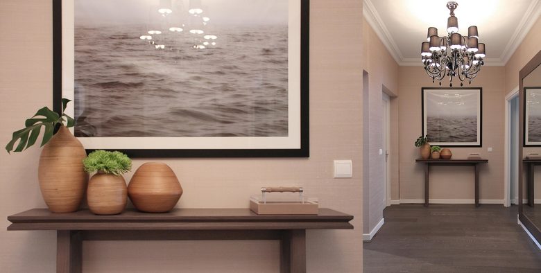 Die Seidentapete und die grosse Lüster heissen die Bewohner im Eingangsbereich willkommen. Ein auf Mass gefertigtes Möbeldesign, wunderbare Stoffe und kleine Details, repräsentieren einen hochwertigen Innenausbau. Unser persönliches Lieblingsstück ist das Bett im Elternschlafzimmer, mit weissem Headboard aus Seide; hier liegt man mit dem Blick auf das blaue Meer.