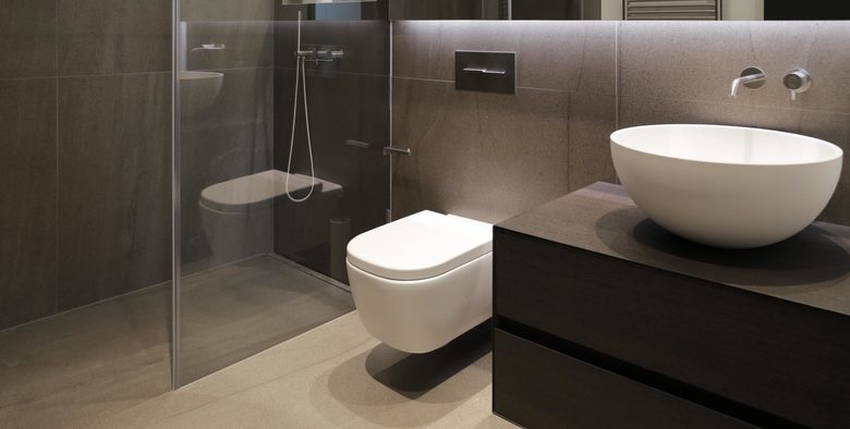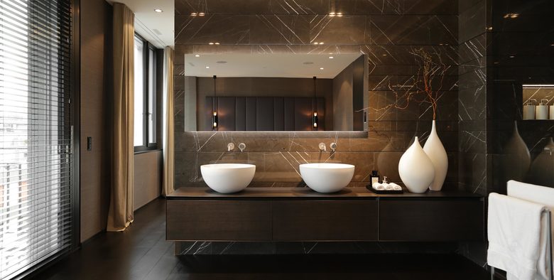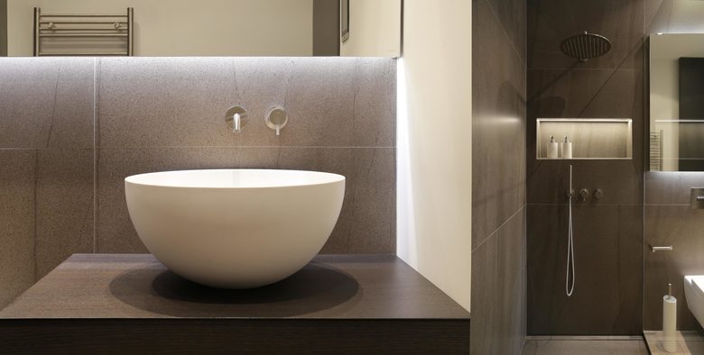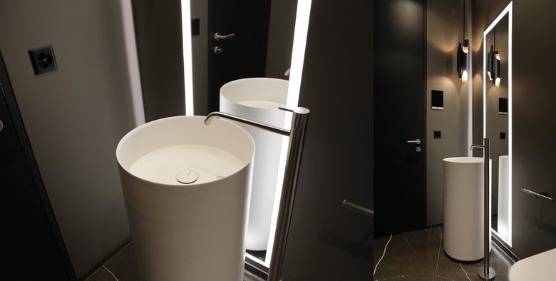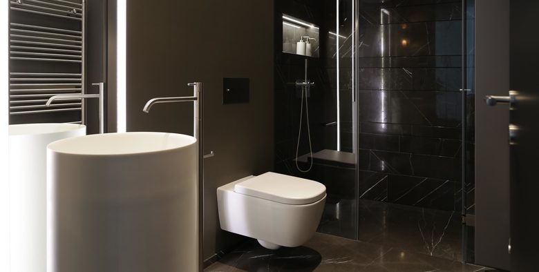 Das Kinderbad ist schlicht und praktisch gehalten. Der grosse Waschtisch bietet genügend Stauraum für alles Nötige. Im Gästebad haben wir mit der Beleuchtung gespielt und durch einen hinterleuchteten Spiegel, eingebaute Spots in der Decke und eine Pendelleuchte neben dem frei stehenden Waschbecken ein elegantes Ambiente erzielt. Eine ganze Marmorplatte auf dem Boden macht den Raum nochmals besonders.