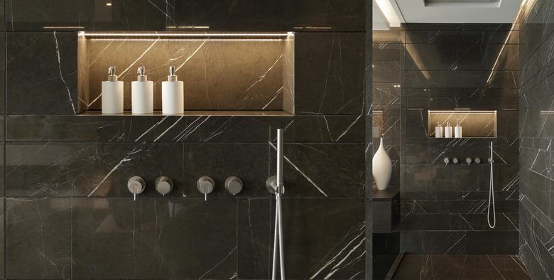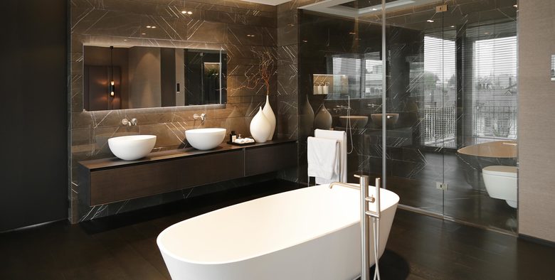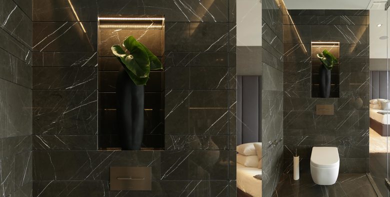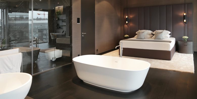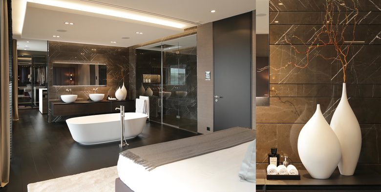 Das Elternbad im Penthouse Kloten wurde grosszügig und fliessend in das neue Schlafzimmer integriert. Die Marmordusche mit Wasserfall und farbiger LED-Beleuchtung, bietet ein Gefühl vom Privat-Spa. Eine grossformatige Marmorplatte in der Dusche, die aus einem Stück gefertigt wurde, unterstreicht den hochwertigen Innenausbau. Die frei stehende Badewanne wurde zentral in den Raum gestellt und dient als Blickfang. In die abgehängte Decke konnte eine indirekte Beleuchtung integriert werden, diese schafft ein warmes und, nach Wunsch, gedämmtes Licht.
