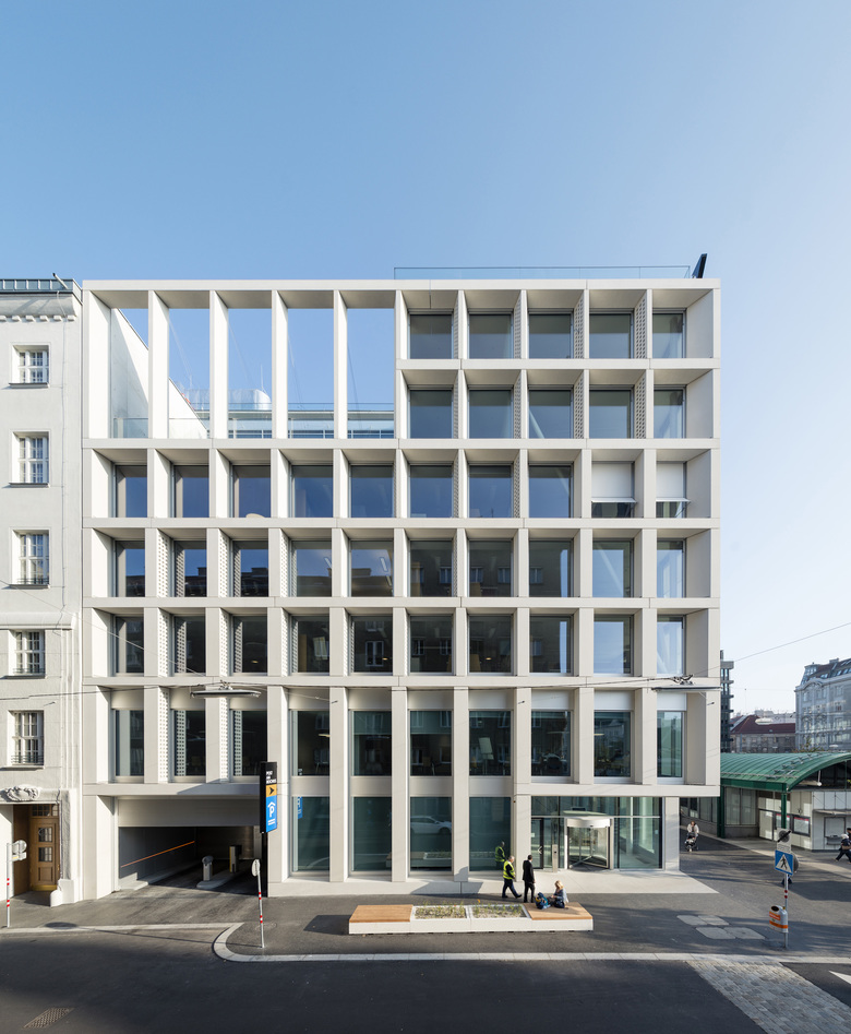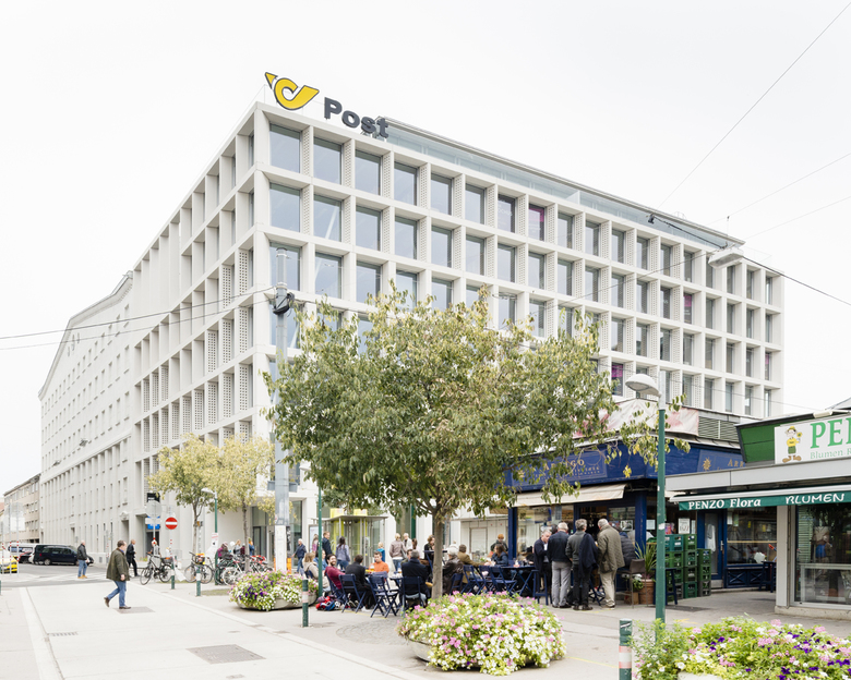 Für die Architekt_innen stand die kontextuelle Entwicklung des Entwurfes im Fokus, um elegante, zeitlose und hochwertige Architektur zu schaffen. Diese überzeugt mit einer ruhigen und klaren Gesamthaltung, die ausgehend von der gerasterten Fassade nach innen getragen wird. Der Baukörper nimmt den polygonalen Grundstückszuschnitt auf und mit seiner städtebaulichen Stellung sowie plastischen Ausformulierung seine Aufgabe als wichtige Institution im öffentlichen Stadtraum wahr. Das Gebäude fügt sich stimmig und proportional als Stadtbaustein in seine Umgebung ein und wird dabei mit dem urbanen Umfeld verknüpft: Die Platzebene des Rochusmarktes setzt sich als Shoppingmall im Gebäude fort und bindet als öffentlicher Durchgang den Grete-Jost-Park an. Die Eingänge zur künftigen Postfiliale sowie zur Mall schaffen gemeinsam mit der Fassade einen Dialog mit der Stadt. Das Gebäude schließt die vormaligen städtebaulichen Lücken des Grundstücks und wird damit zum selbstverständlichen Teil des städtischen Gewebes. Das denkmalgeschützte Bestandsgebäude wurde in den Neubau integriert. Durch die haptische Materialität wie auch durch das ruhige nuancierte Spiel der Fassade erzeugt das neue Gebäudeensemble für das Leben am Rochusmarkt eine unaufgeregte und dennoch starke Präsenz im Hintergrund.