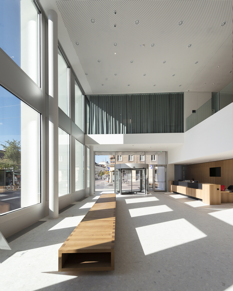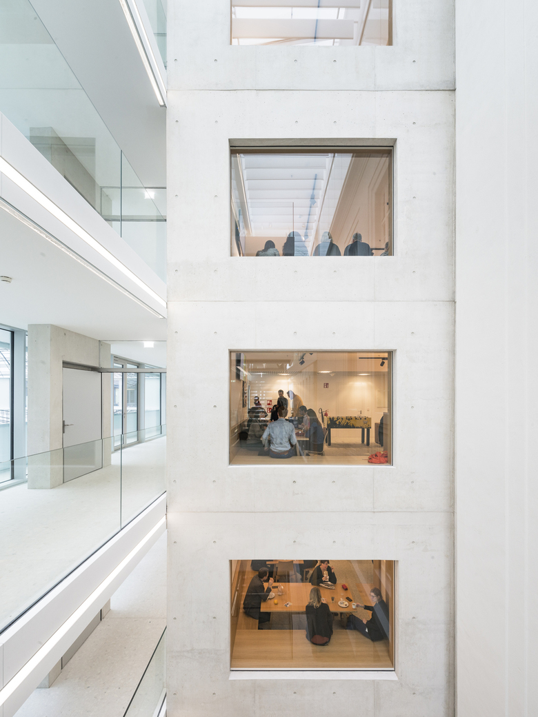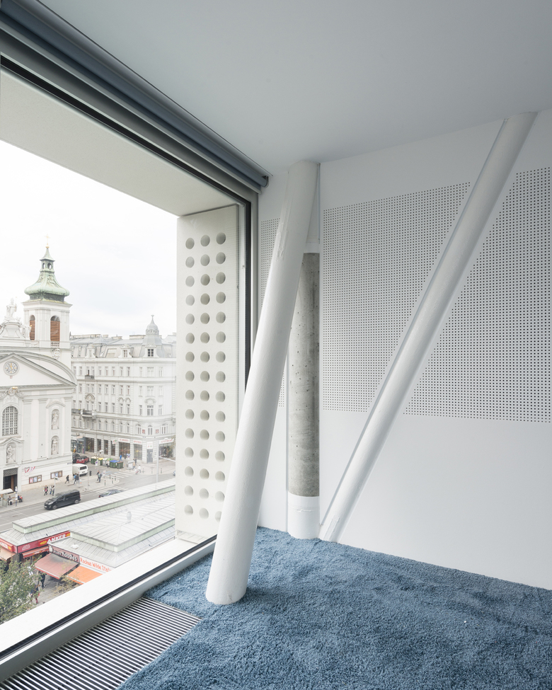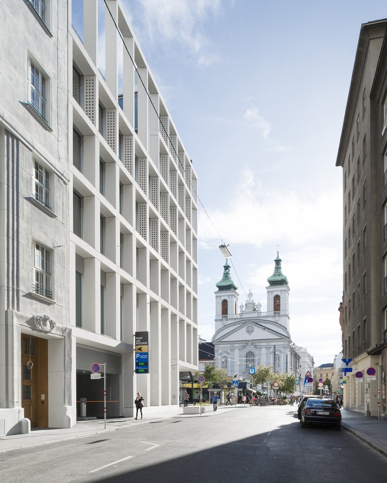 Ein Teil des bestehenden Gebäudes (Rasumofskygasse 29) ist einerseits aufgrund der Art- Deco-Fassade aus den 1920er Jahren, andererseits aufgrund besonderer technischer Einbauten denkmalgeschützt. Dieser Teil wurde saniert und zu einer Bürolandschaft umgebaut, die auf aktivitätsbasiertes Arbeiten sowie eine flexible Belegung der Räume zugeschneidert ist. An der Schnittstelle zwischen Alt und Neu schaffen die Architekt_innen eine Fuge in Form eines mehrgeschossigen, lichtdurchfluteten Atriums zur Begegnung und Kommunikation. Gleichzeitig fungiert der Raum zwischen Alt- und Neubau als Verteiler im Gebäude. Gemeinsam mit dem Hauptzugang zum Büro der Post wurde diese innere Erschließung der Büroflächen besonders positiv von der Jury beurteilt. Der Neubau und der denkmalpflegerisch erhaltenswerte Bau bilden damit ein kompaktes, selbstbewusstes Ensemble.