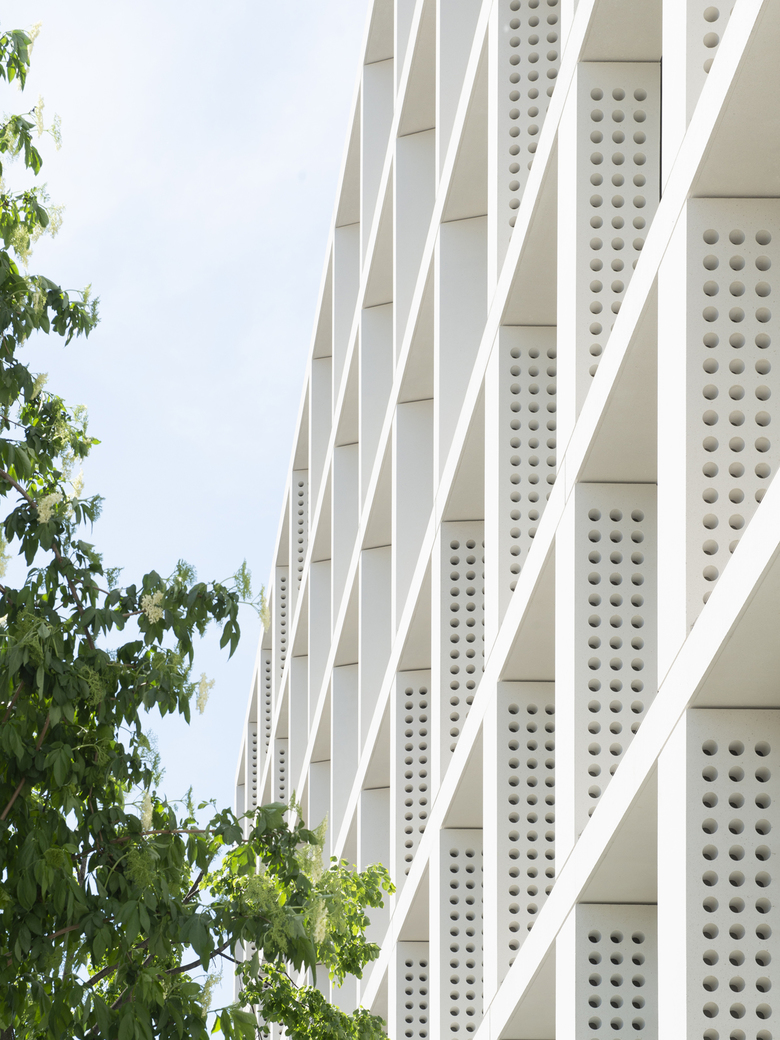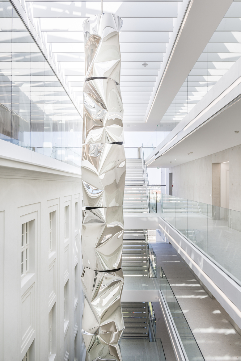 Die räumliche Struktur des Gebäudes ist hinsichtlich des langfristigen Einsatzes mehrfach lesund nutzbar. Ausgehend vom denkmalgeschützten Bestandsgebäude wurden die neuen Räume so entwickelt, dass sie zukünftige alternative Verwendungszwecke sowie vielfältige Anpassungsmöglichkeiten in der Haustechnik erlauben. Trotz der flexiblen Organisation im Inneren strahlt der Baukörper mit seiner identitätsstiftenden Fassade Kontinuität und Zeitlosigkeit, und damit Nachhaltigkeit, aus. Der Verlauf der Betonfertigteile vom rechtwinkeligen zum konischen Zuschnitt bildet mit einfachen Mitteln eine – durch die Luftperforationen verstärkt – bewegt wirkende Fassadenstruktur aus Repetition und Differenz und bietet in den Büroräumen jeweils einzigartige Ausblicke. Somit werden Funktion und Gestaltung durch die parametrischen Elemente vereint.
