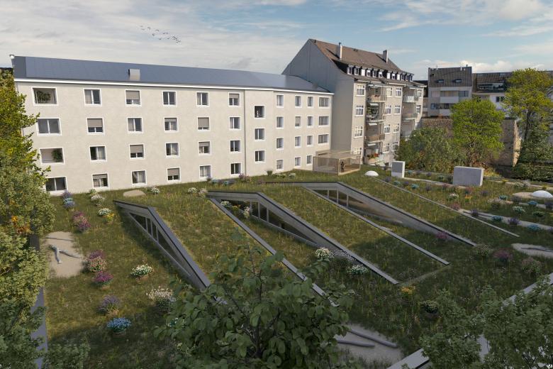 Die Liegenschaft wurde Ende der 1950er-Jahre für den Krankentransportdienst erbaut. Der Hauptstandort der Sanität Basel wird umfänglich saniert, räumlich angepasst und erdbebenertüchtigt. Der offene Hof wird komplett überdacht und schafft dadurch mehr Platz für die Rettungswagen. Die grosse Einstellhalle erhält natürliches Tageslicht über grosse Oberlichter und das neue Dach wird intensiv begrünt.