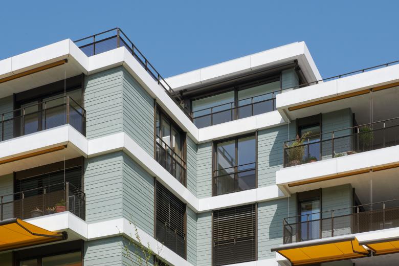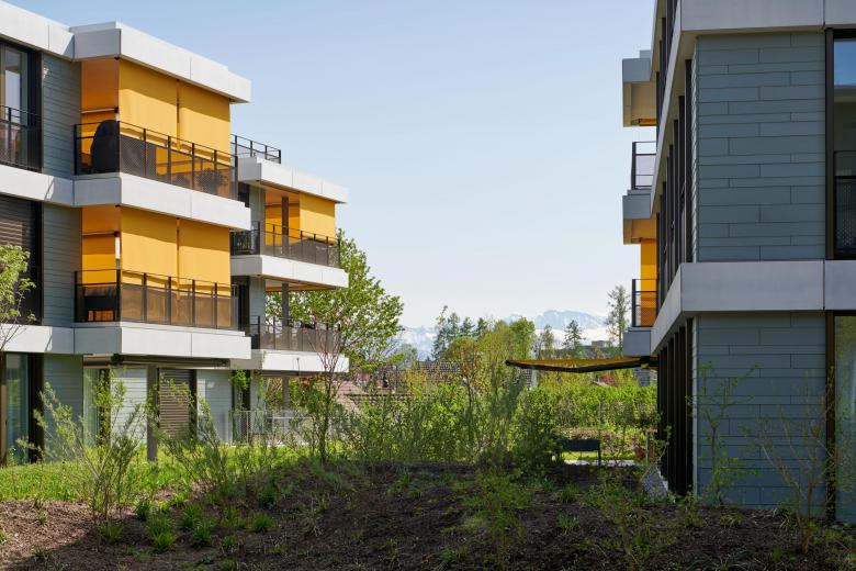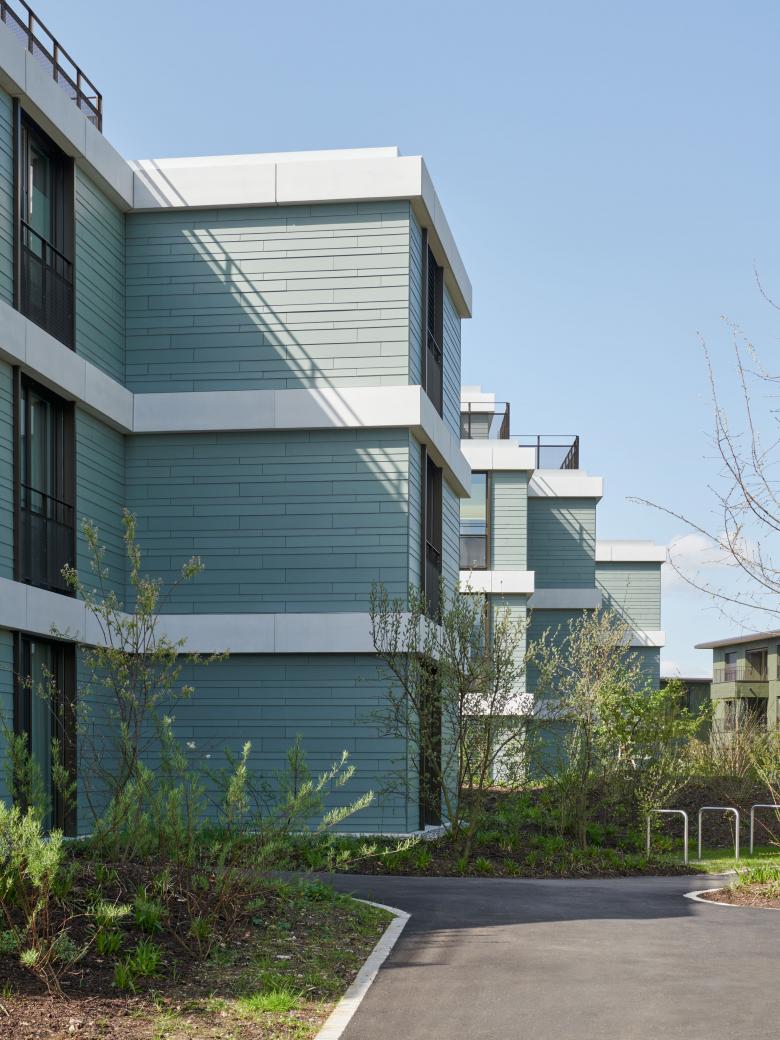 Die Wohnüberbauung liegt auf einer Hügelkuppe im Südosten der Gemeinde Gossau ZH. Vier kompakte Baukörper stehen leicht zueinander verdreht, wodurch das angrenzende Waldstück sichtbar bleibt und der Grünraum zwischen den Häusern in die Siedlung hineinfliessen kann. Die als Vierspänner konzipierten Häuser enthalten je rund zehn Eigentumswohnungen, wobei jede Wohnung über eine dreiseitige Orientierung verfügt. An den Süd gerichteten Gebäudeecken liegen grosszügige Balkone, flankiert von den Küchen und Wohnzimmern, die im Innern eine Übereck-Komposition bilden. Helle Betonbänder zeichnen die Geschossdecken nach und sorgen für eine horizontale Struktur.