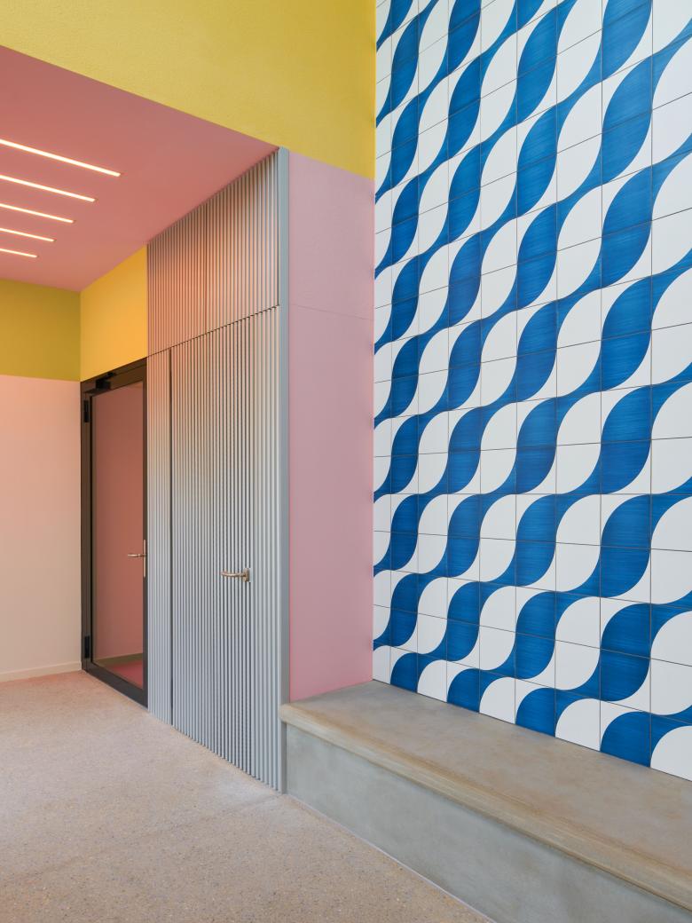 Das Eingangsgeschoss ist durchlässig und sowohl von der Quartierstrasse im Osten als auch von der Langsamverkehrsachse im Westen, die entlang der Bahngleise verläuft, zugänglich. Im «Sorrento», dessen Namen an einen ebenfalls hell in Erscheinung tretenden Hotelbau in Miami Beach erinnert, wird vom Erdgeschoss bis ins 20. Obergeschoss gewohnt. Die 116 kompakten Mietwohnungen richten sich an ein junges Publikum. Im Gegensatz zu den zurückhaltend gestalteten Wohnungen zeichnen sich die halböffentlichen Erschliessungsräume durch eine kräftige Farbgebung aus, wie sie auch für das Miami der 1950er-Jahre oder die damals entstandene Pop Art typisch ist. Ein ausladendes Vordach und eine durch farbige Muster und Spiegel geprägte Eingangshalle heissen die Bewohnerinnen und Bewohner willkommen.