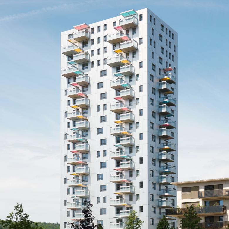 Durch seine Materialität strahlt das Gebäude eine grosse Eleganz aus. Die Aussenhülle aus eloxiertem Aluminium besticht durch ihre Einfachheit und unterstreicht mit ihrer präzisen Konstruktion die skulpturalen Qualitäten des Baukörpers. Zudem prägen die frei schwebenden Balkone sowie deren Schattendächer aus bunten Metall-Lamellen den Ausdruck des Hauses.