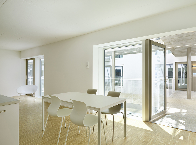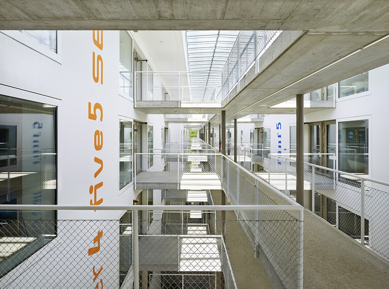 Vier einbündige von Ost nach West verlaufende Zeilenbauten werden zu zwei Wohnhäusern mit zentralem Erschliessungshof gruppiert. Ein zweigeschossiges Randgebäude im Osten, dem ETH-Campus zugewandt, verbindet und verdichtet die beiden sechs- und siebengeschossigen Baukörper zu einem städtischen Gebäudekonglomerat. Nach Westen öffnen sich die vier Zeilen zur Landschaft. Um der Lage des Grundstücks am Übergang von Stadt und Landschaft gerecht zu werden, sind die Baukörper in Länge und Höhe gestaffelt. Dichte und Höhe steigern sich von Südwest nach Nordost, von der Landschaft zur Stadt. Zwischen den Volumen entwickelt sich ein dichtes Netz von Erschliessungswegen, die durch mehrere Räume mit unterschiedlichen Abstufungen von Öffentlichkeit und Privatheit führen. Diese entwickeln sich analog zur Volumetrie vom öffentlichen Stadtplatz im Nordosten zum semiprivaten Aussenraum im Südwesten.