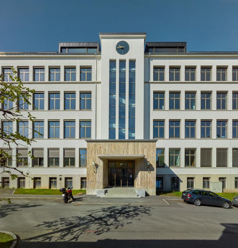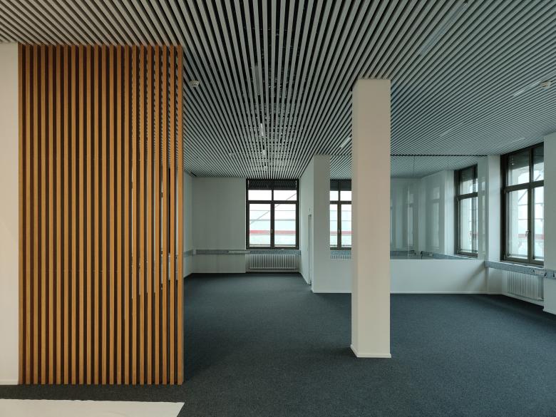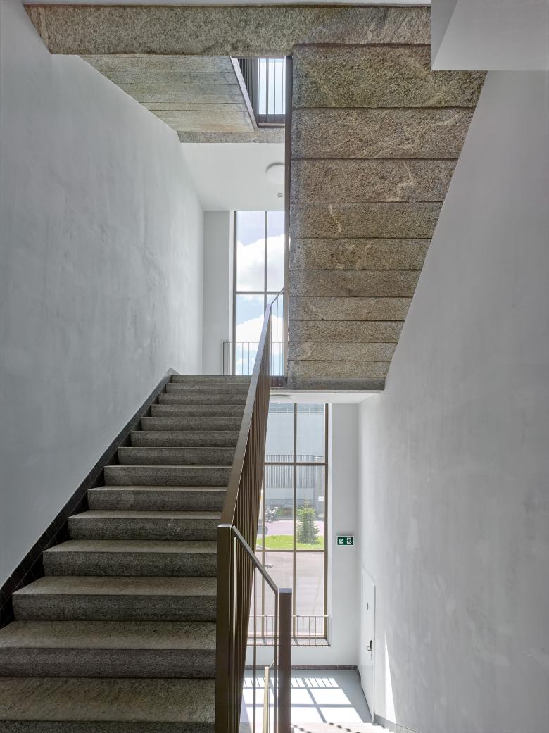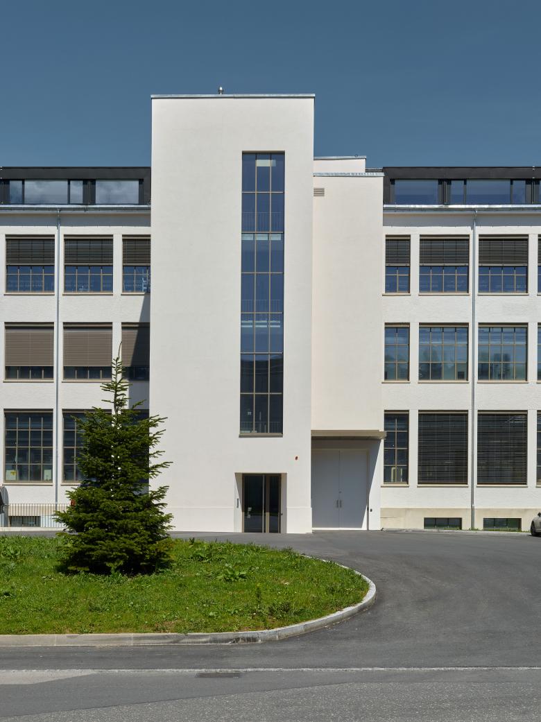 L‘aile Est, bâtiment de tête, s‘impose comme façade principale orientée sur la ville. Elle regroupe les surfaces administratives sur quatre niveaux.