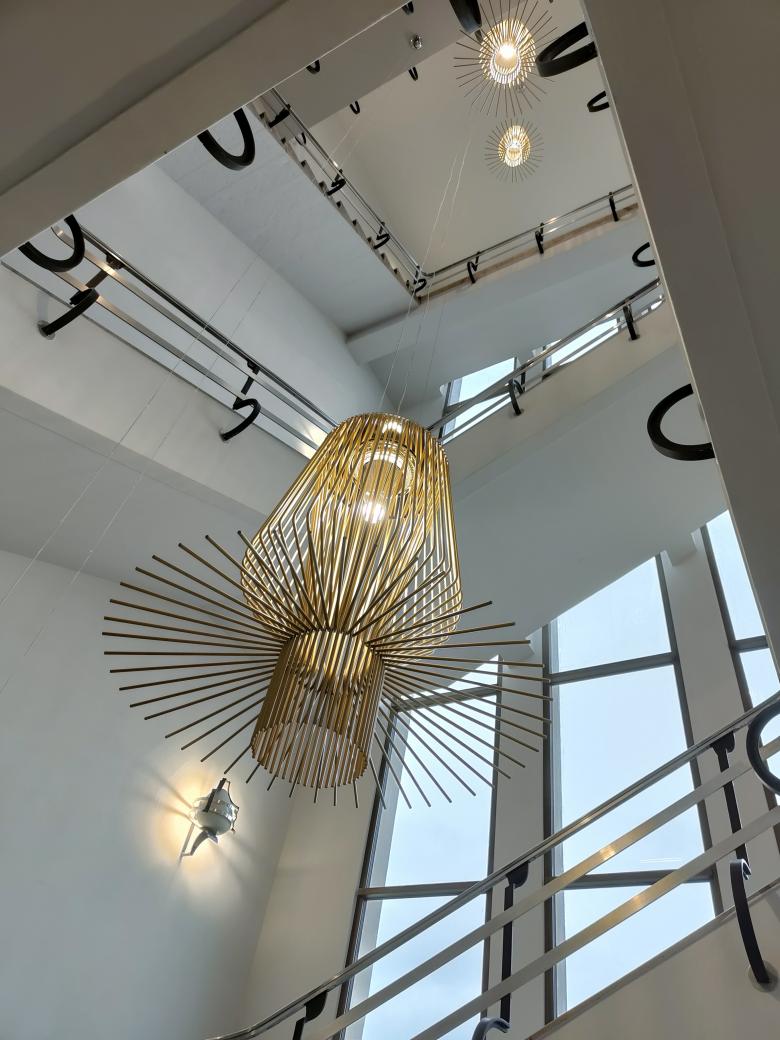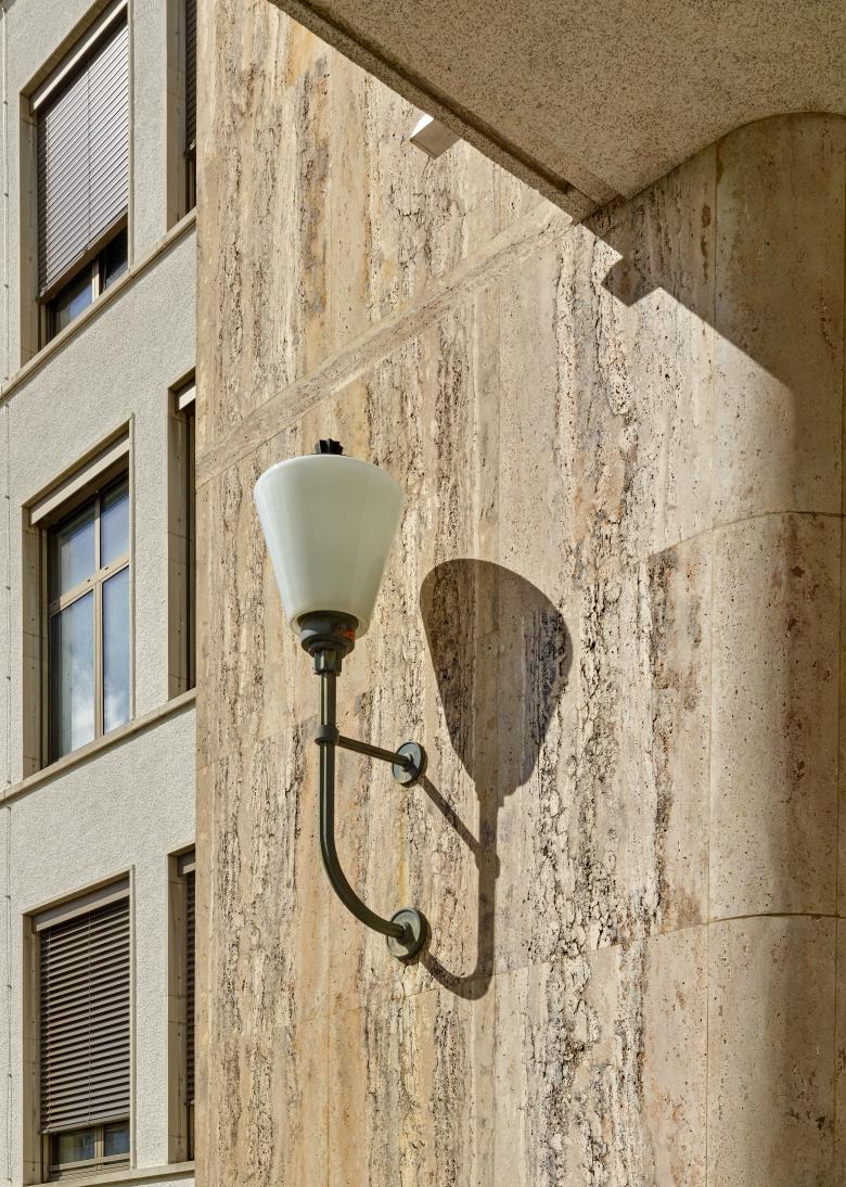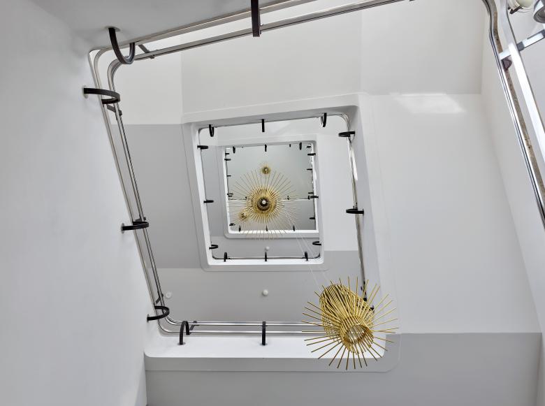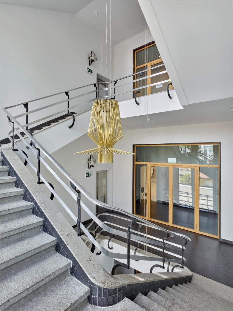 L’entrée principale du bâtiment est caractérisée par un porche surélevé de la rue par quelques marches. Son habillage en travertin et les luminaires cadrant la porte d’entrée illustrent toute l’attention portée par les concepteurs de l’époque au choix des matériaux. Symbole de l‘esprit avant-gardiste déjà présent à l‘époque de sa conception, un escalier monumental distribue les différents niveaux, du hall principal jusqu’au dernier étage nouvellement aménagé. Autour d‘un vide baigné de lumière naturelle, les volées de marches en granit ainsi que les garde-corps et les appliques lumineuses d’origine ont été restaurés. La revalorisation de cet espace est complétée par l’installation de quatre lustres suspendus.