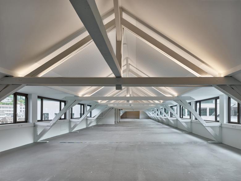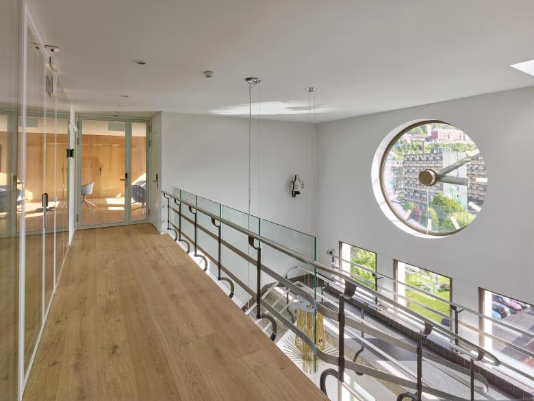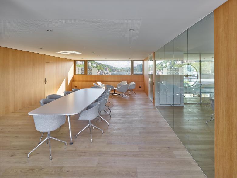 L‘arrivée au dernier niveau permet de découvrir les salles de conférence, complétées par une cafétéria à disposition de tous les utilisateurs du bâtiment. Faisant la part belle au bois de chêne, les revêtements de sols et de parois confèrent à ces espaces une ambiance chaleureuse. L‘ouverture de larges baies vitrées sur une terrasse, la création de lucarnes ainsi que la réinterprétation en transparence de l‘horloge historique apportent une plus-value certaine à ces espaces qui bénéficient ainsi d‘une double orientation, dévoilant de part et d’autre des paysages verdoyants et la Skyline de la ville.