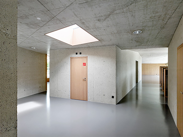 La matérialisation joue sur le contraste : Le béton pour sa durabilité, on le retrouve à l’extérieur et dans les circulations intérieures, et le bois pour sa douceur et sa chaleur, que l’on retrouve dans les salles et le réfectoire.