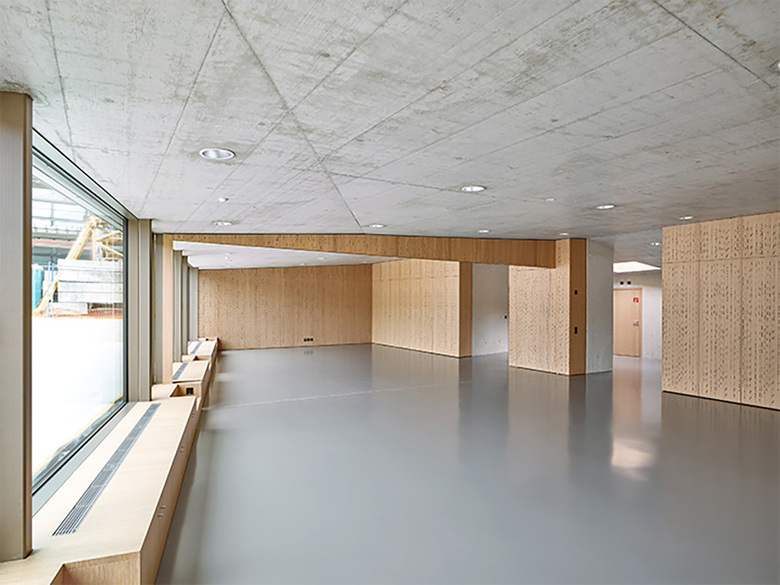 L’organisation des espaces est naturelle et logique. L’entrée est placée à la charnière entre le jardin public et la cour d’école, le vestiaire et le réfectoire sont directement accessibles depuis l’entrée, et les salles d’activités se trouvent de façon fluide dans le prolongement de ces espaces.