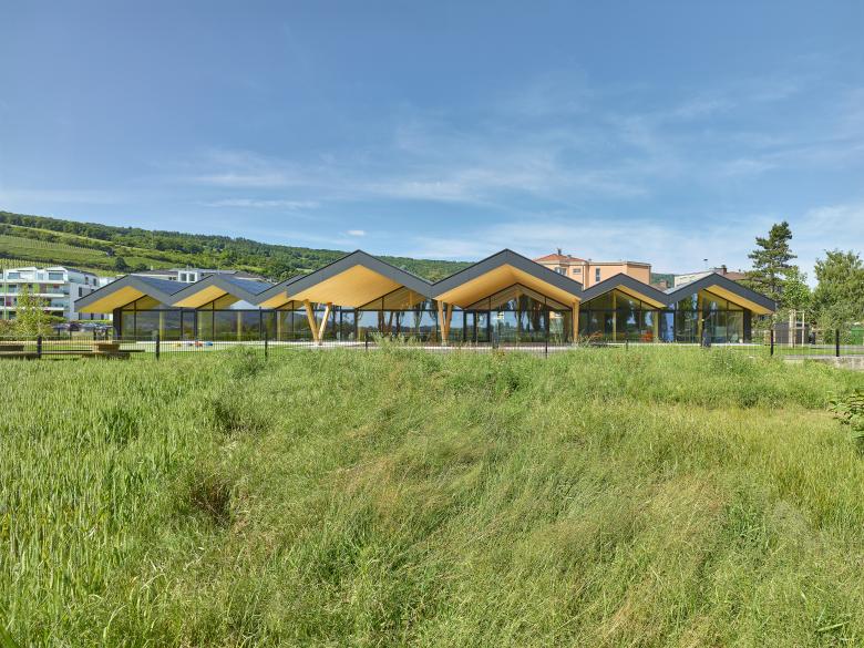 Prévu pour l’accueil de cent enfants, le bâtiment est composé d’un seul niveau coiffé d’une toiture à doubles pans multiples. Cette couverture se prolonge en porte-à-faux au Sud offrant la protection solaire estivale pour la façade vitrée, et s’agrandit au niveau du corps central pour créer un préau couvert qui marque l’entrée de l’établissement.