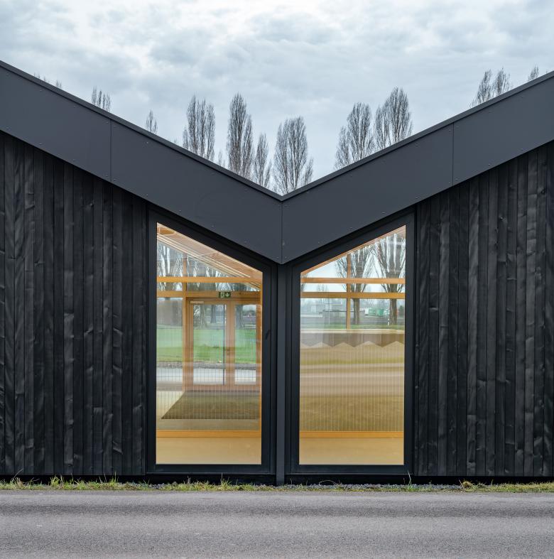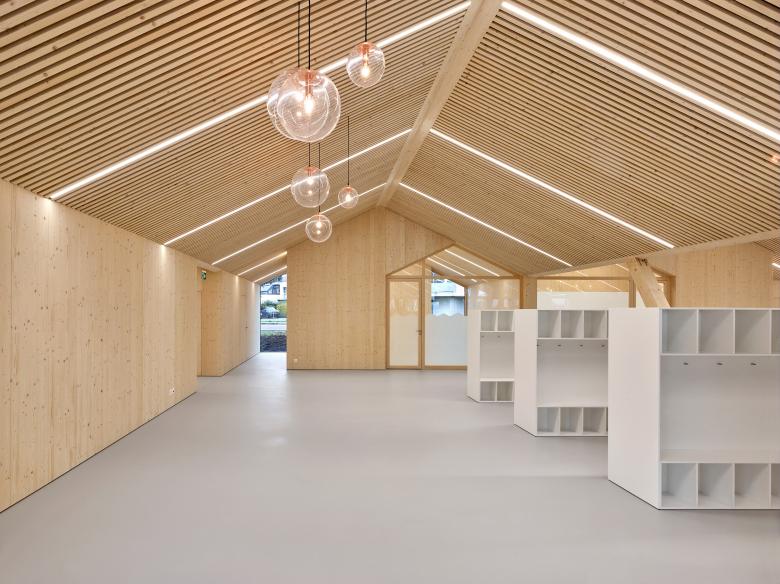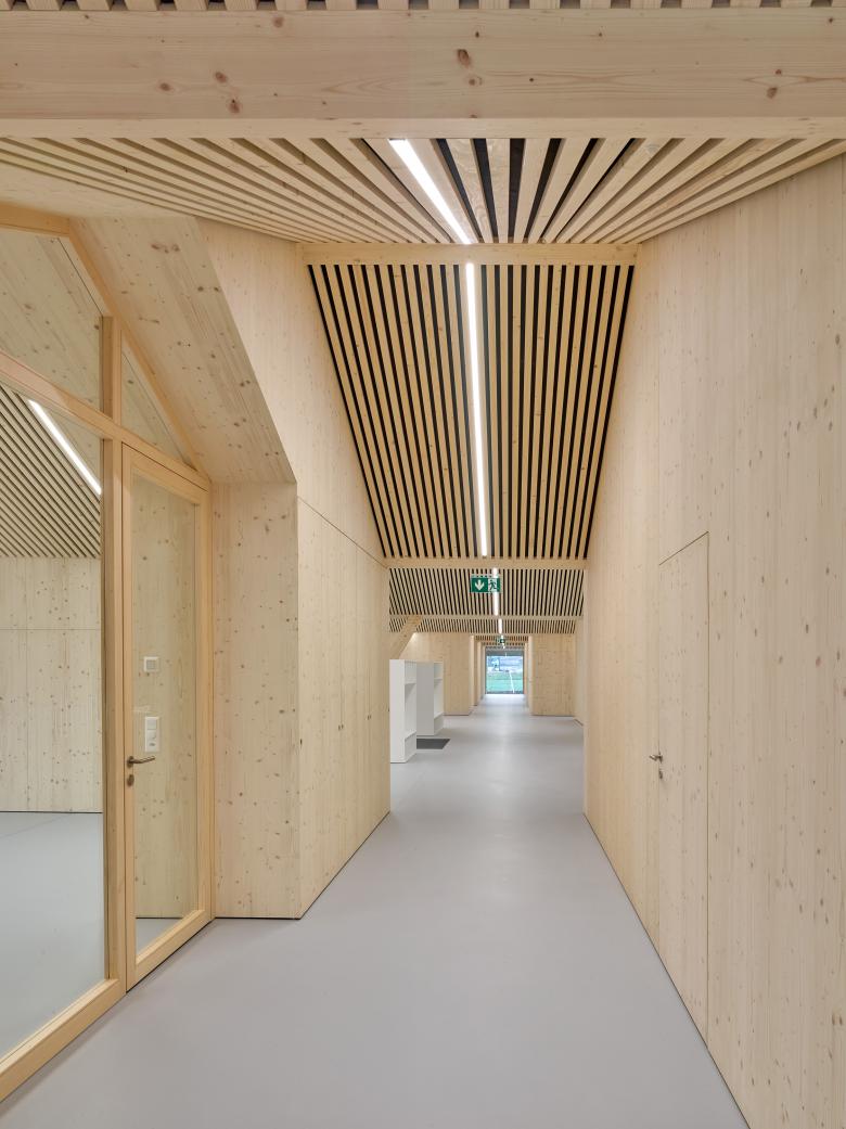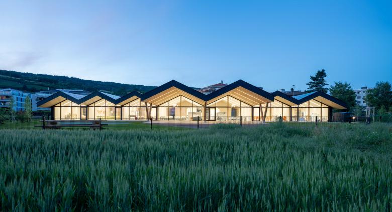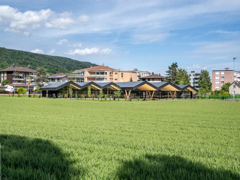 La structure et les façades du bâtiment sont réalisées en bois provenant des forêts communales, assemblées en construction modulaire préfabriquée. Outre le bilan écologique intéressant d’une telle construction, elle offre l’avantage de pouvoir être mise en œuvre par tous temps en atelier, réduisant le temps de construction sur place ainsi que la durée des nuisances dans un site sensible, fréquenté par de nombreux élèves de tout âge.