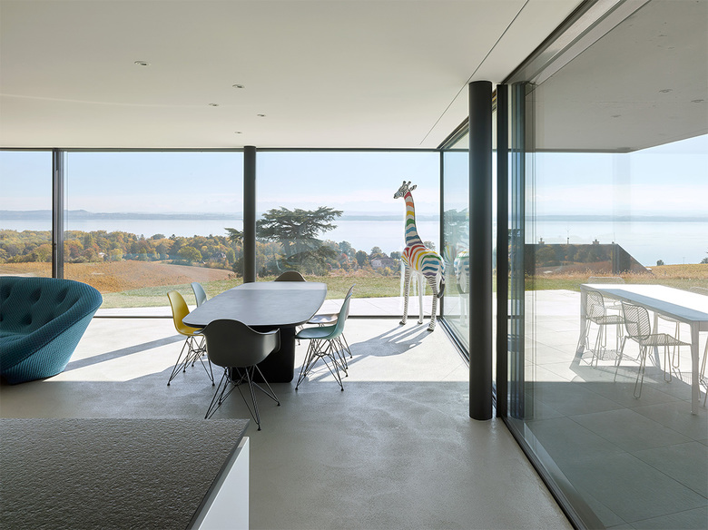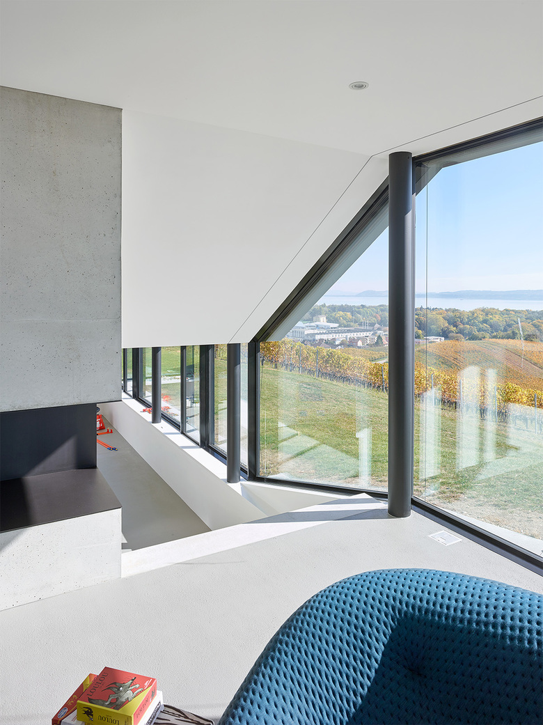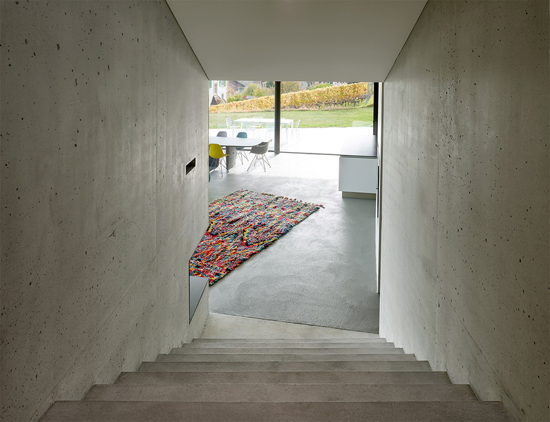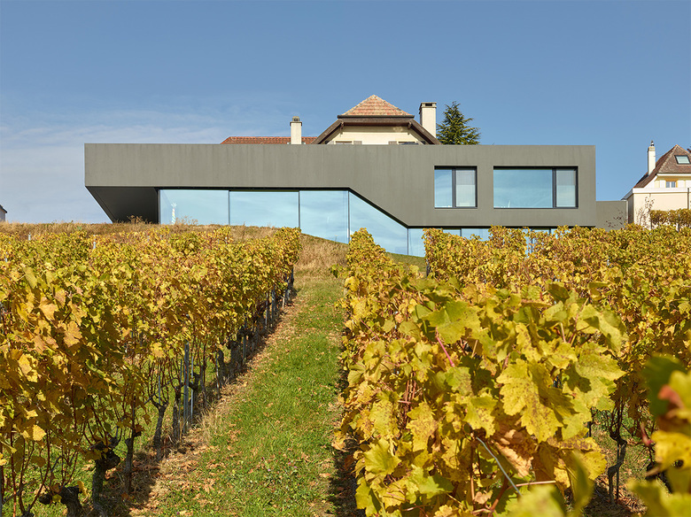 À mi-chemin entre le village et le vignoble de Cortaillod, cette nouvelle habitation semble sortie de terre sous le jardin d’une bâtisse des années 40.