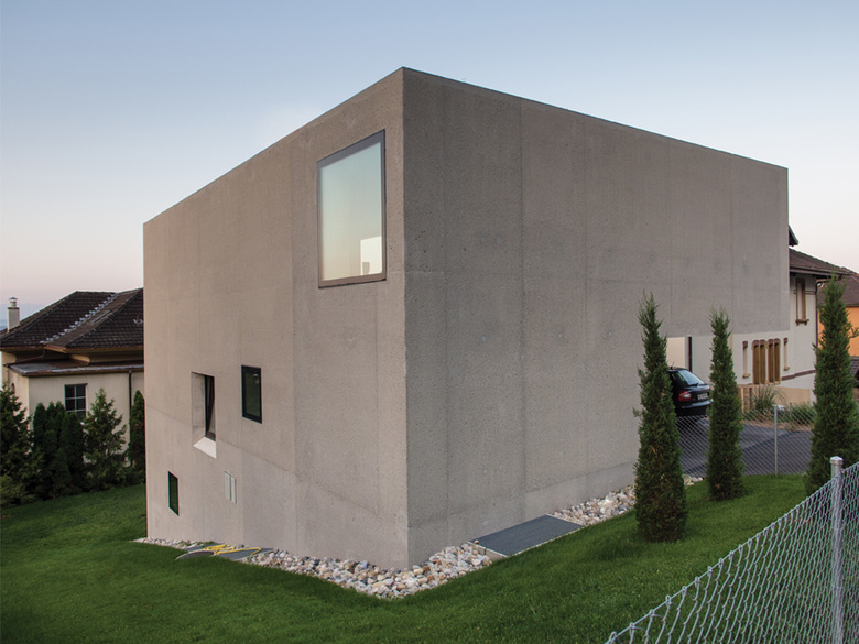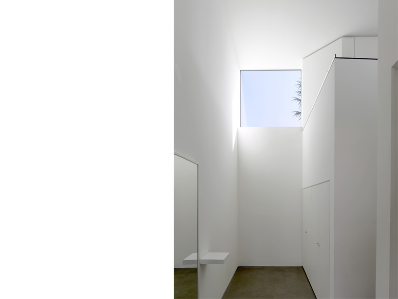 Entourée par les volumes imposants des logements voisins, la construction s’articule selon une stratégie défensive. Avec une forme très compacte et minérale, elle prend place au centre de la parcelle et recherche la lumière interrompue par les bâtiments environnants en se développant à la verticale. Les espaces de vie, séjour, terrasse, salle à manger et cuisine, profitent de cette volumétrie en se trouvant au dernier des trois étages, le plus lumineux.