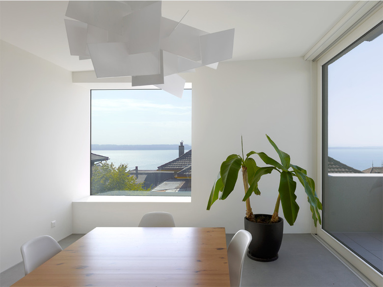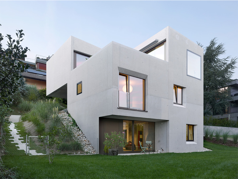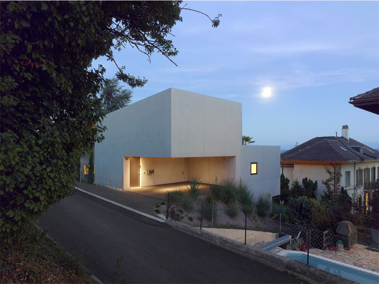 Hermétique au Nord, la maison protège des regards et l’intimité du jeune couple qui l’habite. En revanche, elle dispose de percées entre les bâtiments au Sud et cadre ses ouvertures pour profiter de magnifiques vues sur la ville, le lac et les Alpes. L’organisation interne permet à la lumière de traverser les étages grâce à des doubles hauteurs et des puits de lumière. La zone nuit se trouve à l’étage central, le plus intime, tandis que des espaces polyvalents profitent d’un accès direct au jardin au rez inférieur.