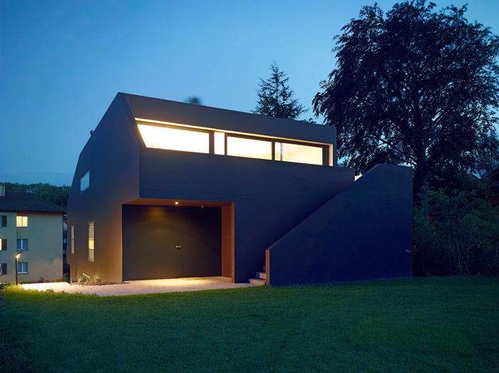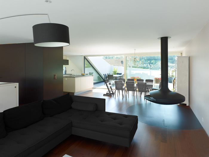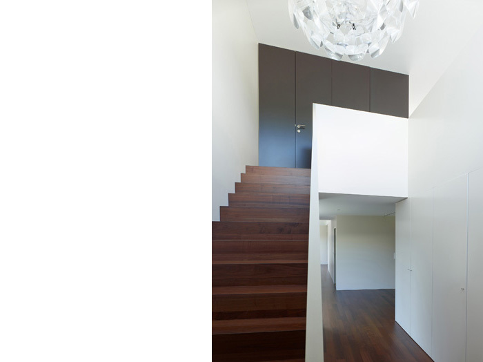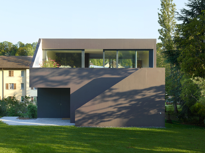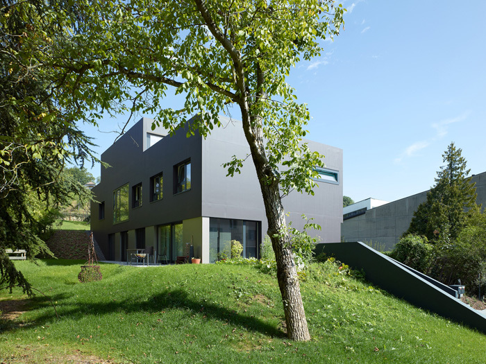 Aux niveaux supérieurs, le hall d’entrée de l’habitation principale dessert l’espace de distribution aux chambres ainsi qu’un escalier menant à l’attique. Là, la zone de jour occupe l’ensemble de l’espace. Côté Sud, une terrasse prolonge le coin à manger, s’ouvrant sur le parc et les toits du vieux village. La hauteur variable des murs de façade crée un paravent aux regards et permet de profiter de cet espace en toute sérénité. Côté Nord, le séjour est prolongé d’une seconde terrasse par laquelle on accède au jardin privatif. Le dégagement s’ouvre alors sur les parcelles de vigne puis le jura.