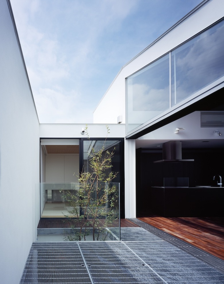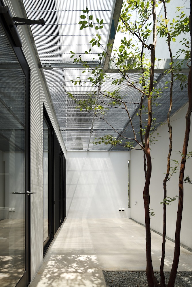 玄関前のピロティガレージに加え、玄関脇には愛車ポルシェ911を格納できるビルトインガレージを配置。廊下脇に設えたコンパクトなガラス張りの書斎からはショーケースに納まる愛車を眺めながら一時が過ごせる。ガレージ奥に設けた主寝室からは中庭が望め、上階に敷設されたグレーチング床を介して十分な朝日が注ぎ込む。