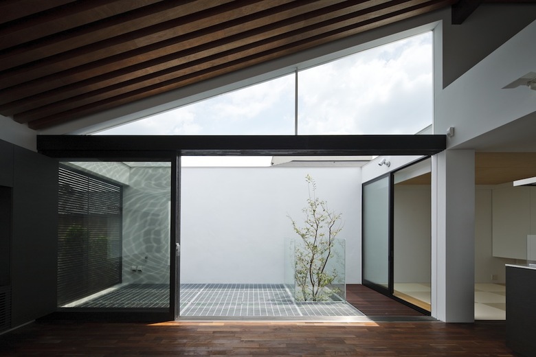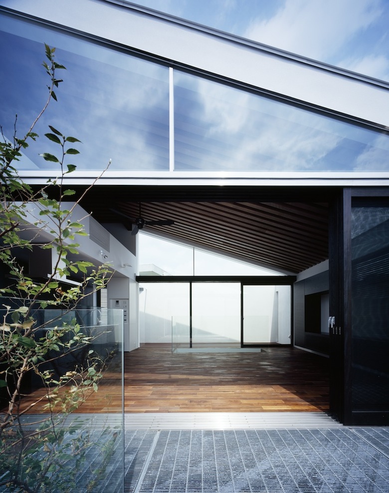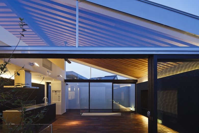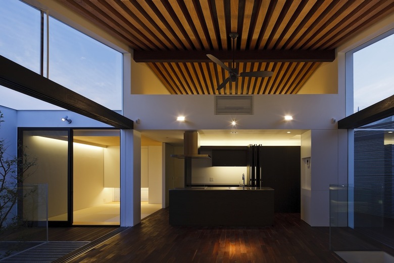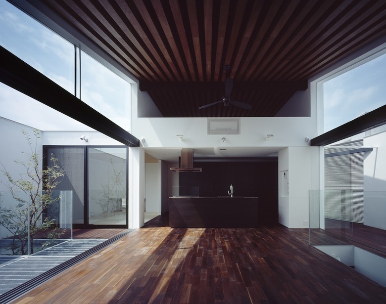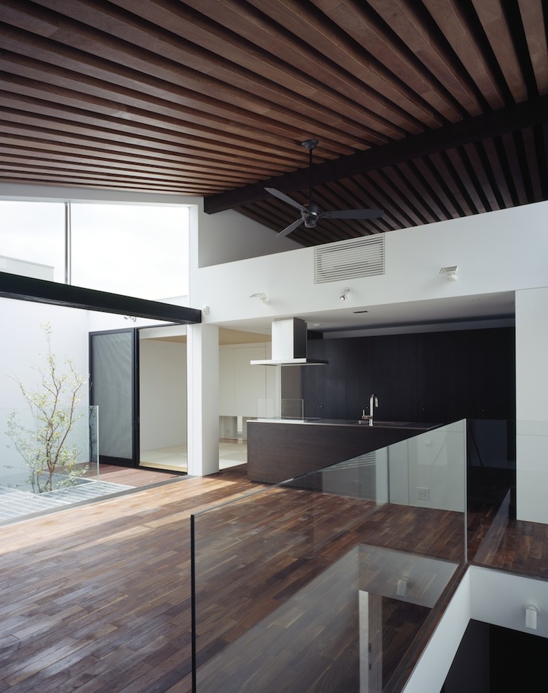 玄関脇から直階段を昇ると現れるのが吹き抜けのファミリールーム。両側に設けた大開口によって切り取られた空の景色が室内に取り込まれ、3枚の木製引戸を全開することで内外が連続する仕掛けだ。アイランドキッチン脇に設けたコンパクトな和室は客間としても利用が可能。バスルーム等水廻りを含めた全空間が外庭と連続しているが、繊細な木製ルーバーにより隣家や街路からの視線が遮られ、プライバシーと開放性を両立させている。垂木と野地板の色味を塗り分けたファミリールームの勾配天井の現しが室内に浮かび上がり、子供の遊び場として設えたロフトと吹き抜けを介してダイナミックに連続している。