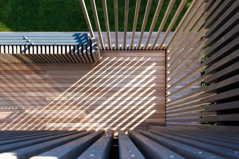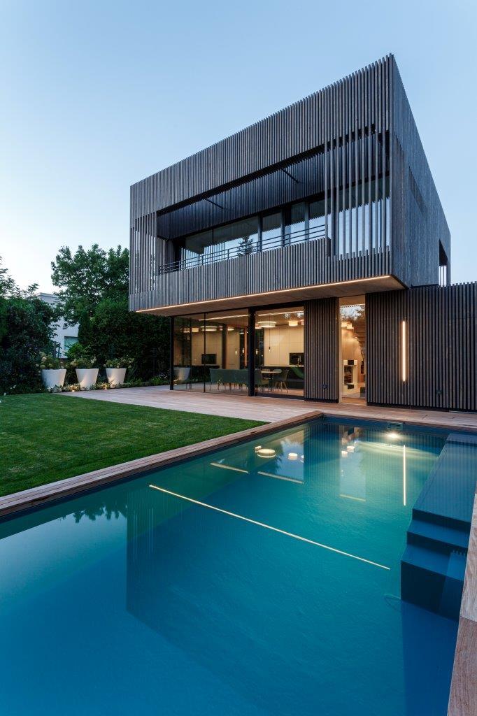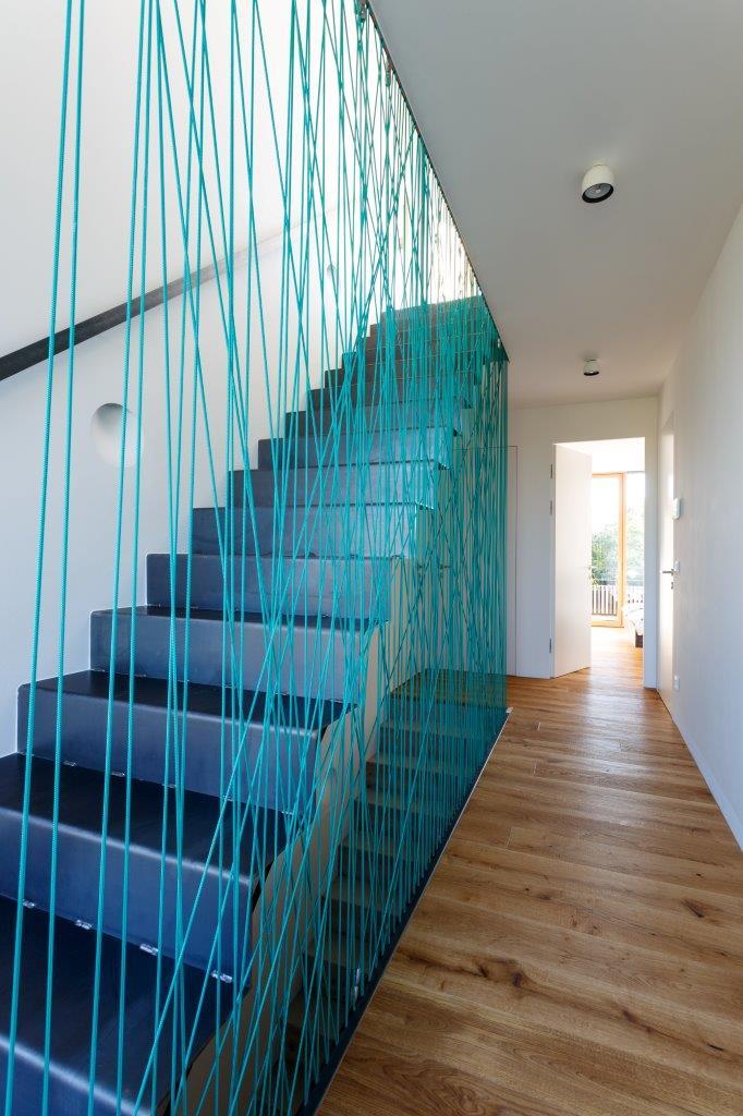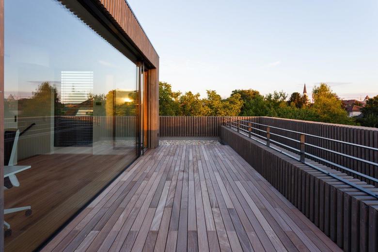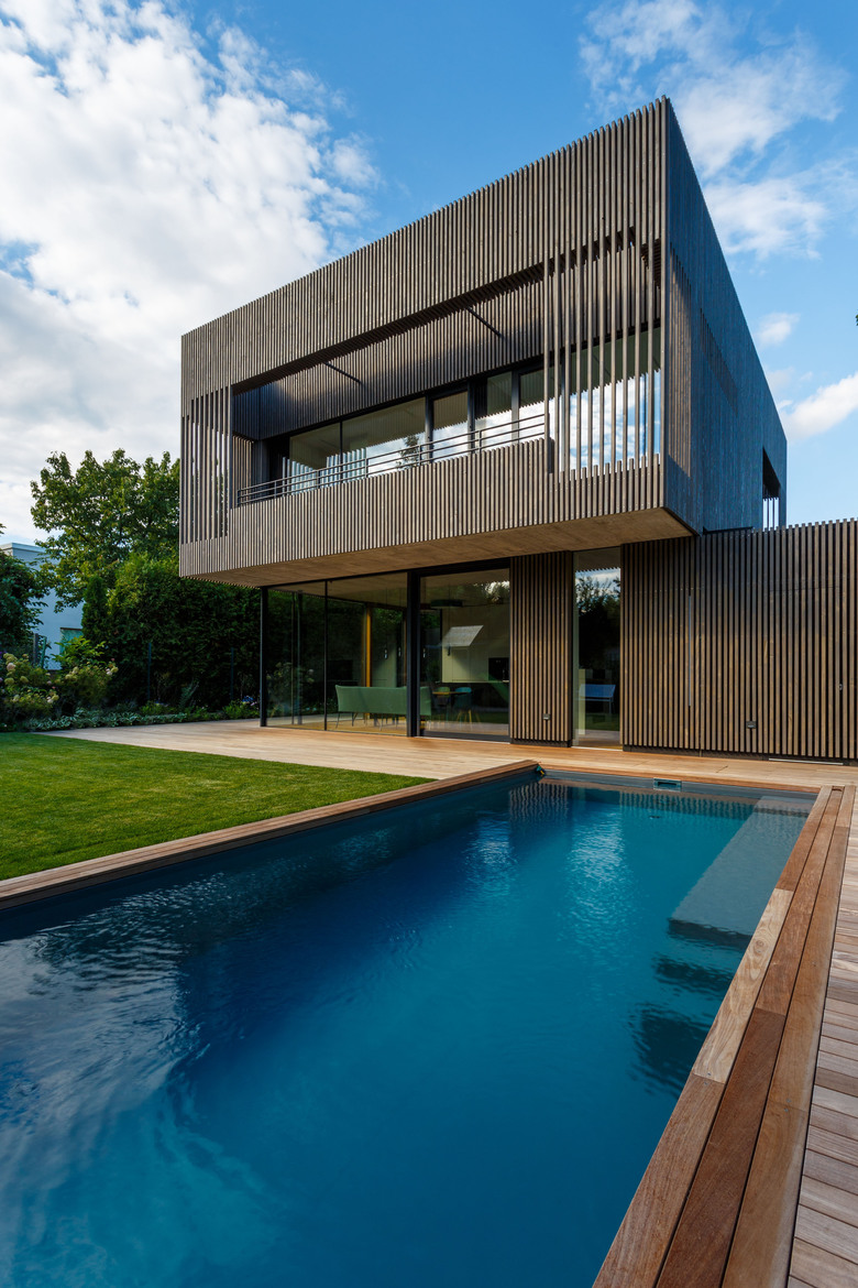 Die eher introvertiert erscheinende Box mit Schlafräumen im Obergeschoß scheint über der Wohnebene mit vorgelagerten Balkonen zu schweben. Der multifunktionale Raum im Dachgeschoß, als zurückversetzte ebenfalls geschlossen wirkende Box, wird vom Garten kaum wahrgenommen und schafft so Intimität und einen Rückzugsbereich.