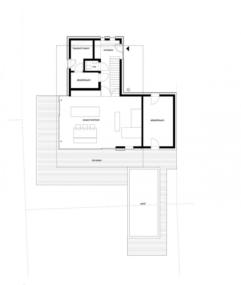 Das transparente Volumen der Wohnräume im Erdgeschoß ist großteils vollflächig und raumhoch verglast um möglichst viel Bezug zum Außenraum herzustellen. Angedockt an die transparenten Flächen sind die erforderlichen Nebenräume nur teilweise über Schlitze belichtet.