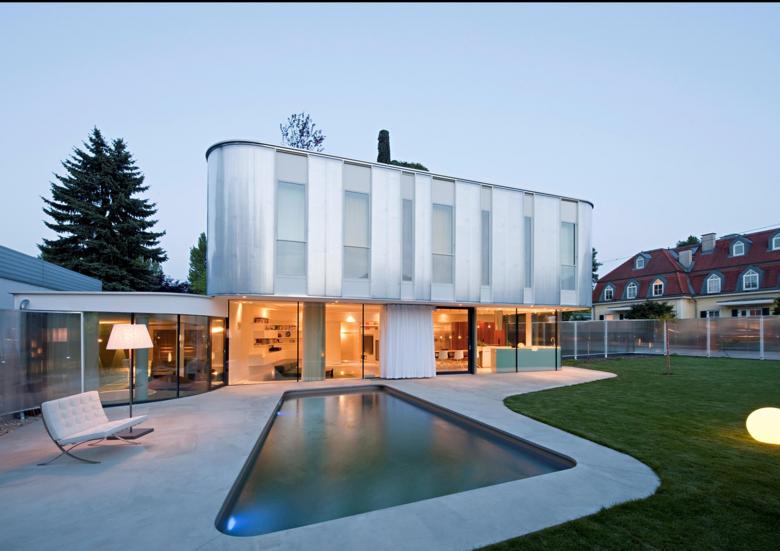 Um den Charakter des unbebauten Gartens zu erhalten, werden der Wohn- und Essbereich im Erdgeschoss und der Garten mit einer großen Schwingungsbewegung vereint. Dadurch entsteht atmosphärisch ein 500m² Wohnzimmer aus Freiraum und Innenraumbereichen. Die Schwingung setzt sich im Wohnmaßstab mit Sitzgruben, geschwungenen Möbeleinbauten, rundem Pool- und Terrassenformen fort.