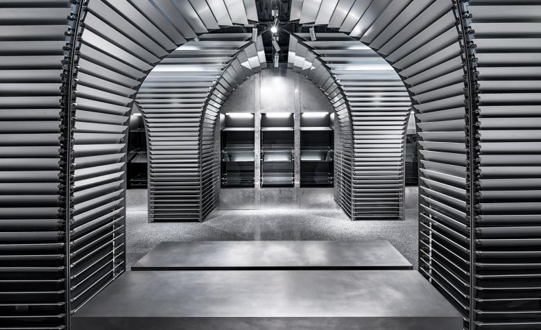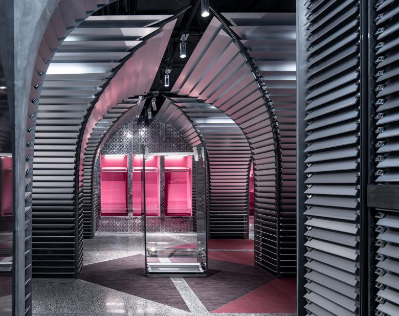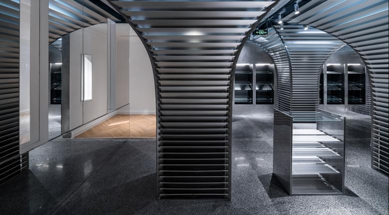 In this project, the store needs to reconcile two different operational needs -- daily retail sales and releases of limited-edition sneakers. dongqi Architects divides the original space into two spaces with distinguishable vibes. The front space along the main path is in keeping with the original Shikumen style of buildings in old Shanghai. Its delightful and cozy ambiance makes it a suitable reception room for product shows or events. The back space for retail sales is deliberately blocked from the main path to create a sense of mystery. Unlike the front space, the back space is built with anodic aluminum oxide, stainless steel, metal textiles, carbon fiber and terrazzo etc.