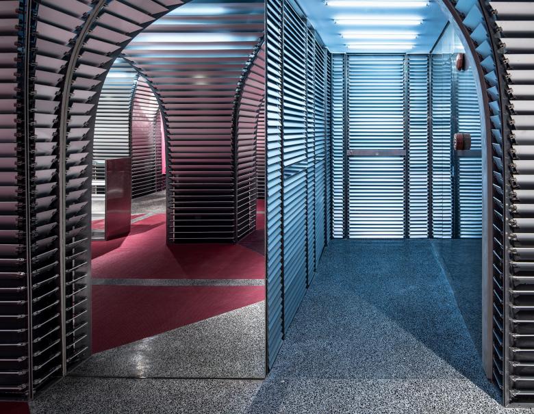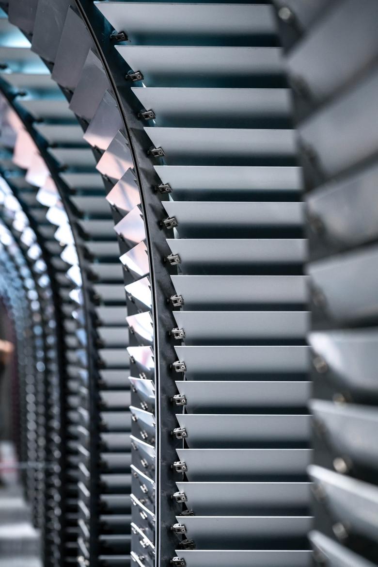 In the umbrella-shaped system, shutters are open or closed to certain degrees based on a designed algorithm. The slats of shutters, which are made of anodic alumina, are able to change angles at different heights to meet the operational needs while maintaining aesthetics. For example, the MEP air conditioning and the lighting system are hidden at the higher place of the columns and the power system are hidden at the lower place. Lights, closed-circuit television, audio sound system, and fire safety equipment are carefully placed between columns.